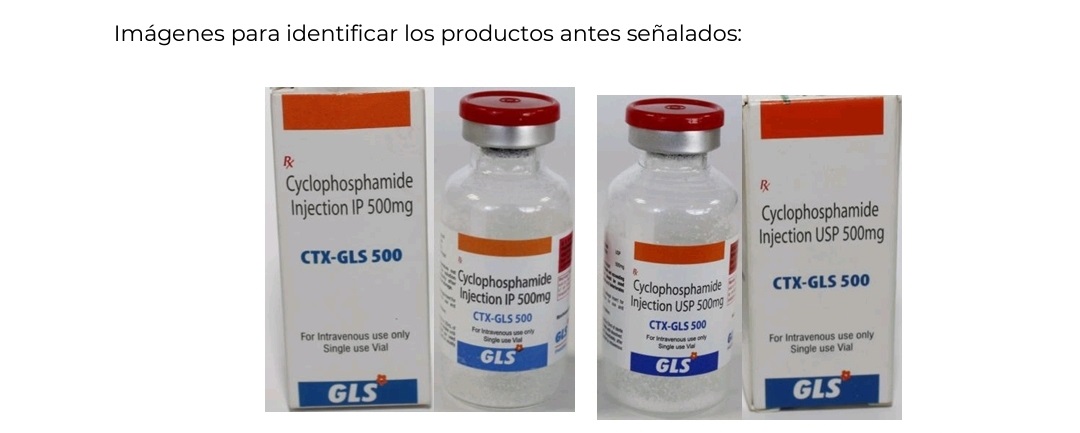 La Secretaría de Salud (SESA) del estado de Querétaro informa que la Comisión Federal para la Protección contra Riesgos Sanitarios (COFEPRIS) emitió Alerta Sanitaria para los profesionales de la salud y a la población sobre la comercialización ilegal de los productos Cyclophosphamide Injection IP 500 mg, con número de lote CYP2129B y Cyclophosphamide Injection USP 500 mg, con número de lote CYPB2210G y fecha de caducidad 07/2024, fabricados por GLS PHARMA LIMITED.