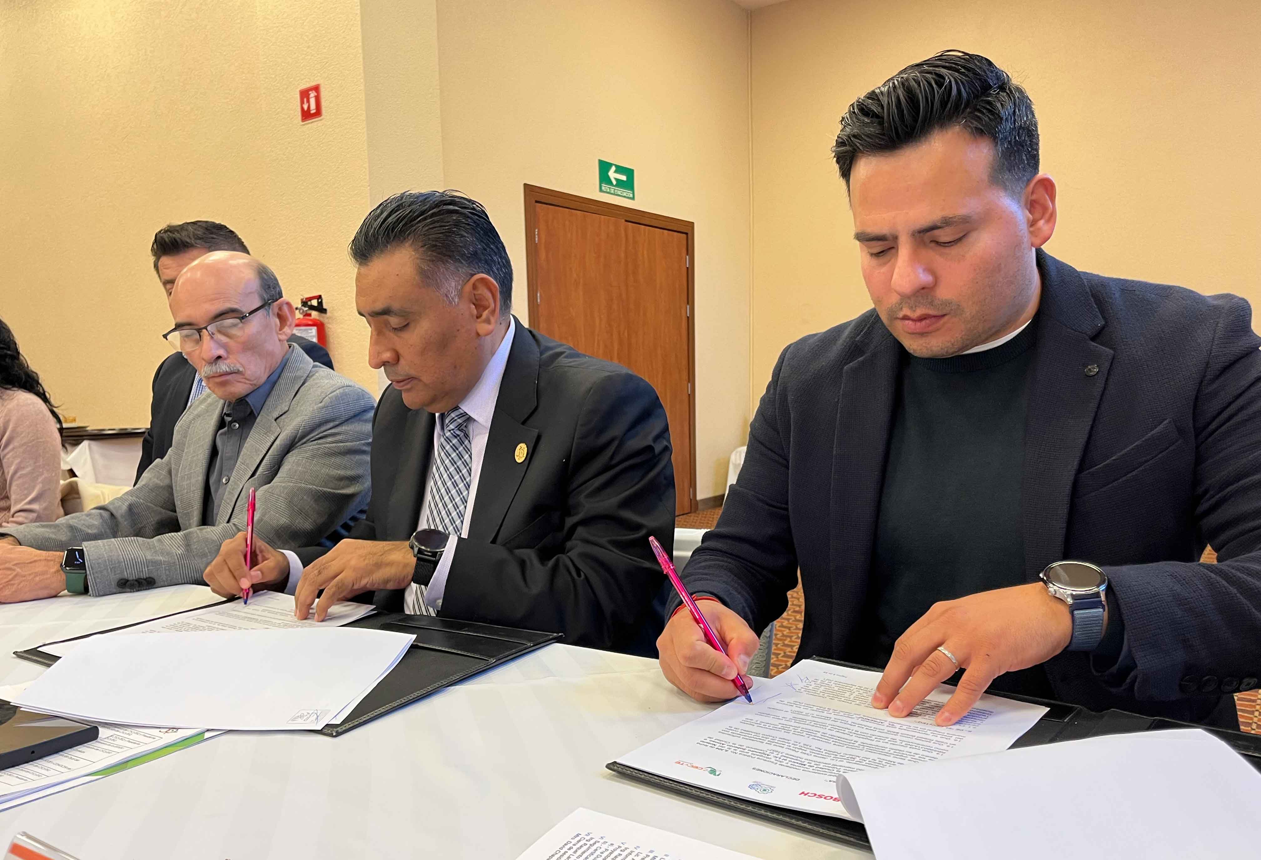 Con el objetivo de fortalecer la formación técnica y profesional de jóvenes estudiantes, el director general del Colegio de Estudios Científicos y Tecnológicos del Estado de Querétaro (CECyTEQ), David Chaparro Aguilar, y el gerente de Recursos Humanos de Robert Bosch México Sistemas Automotrices S.A. de C.V., Jaime Ortiz Pérez, firmaron un convenio de Educación Dual, lo que representa un paso trascendental para impulsar la vinculación educativa y empresarial, creando nuevas oportunidades para el desarrollo del talento joven.