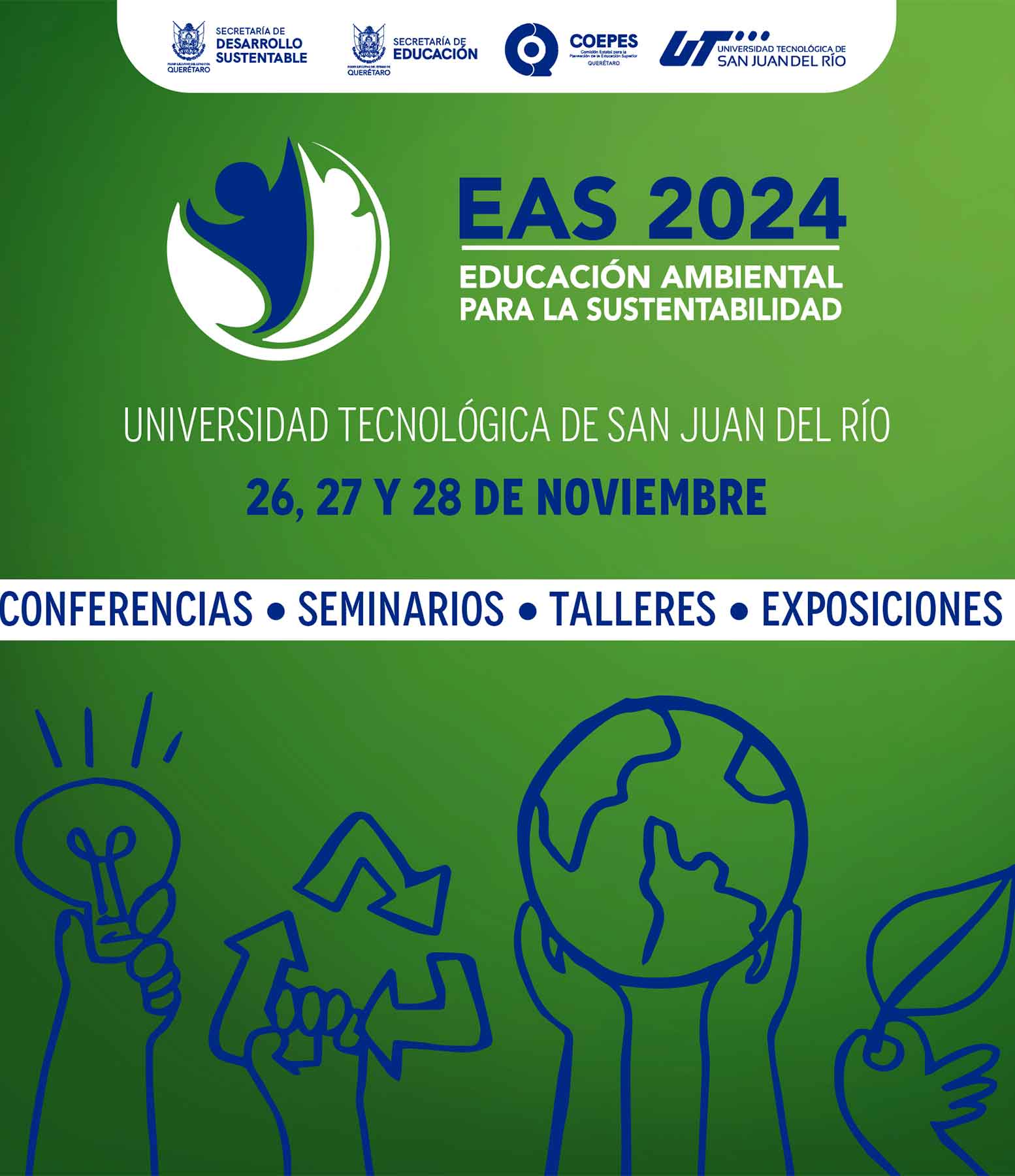 Los días 26, 27 y 28 de noviembre, la Universidad Tecnológica de San Juan del Río, y la Secretaría de Desarrollo Sustentable de Querétaro, llevarán a cabo el Congreso de Educación Ambiental para la Sustentabilidad, EAS 2024, el cual tiene el objetivo de impulsar políticas públicas desde el gobierno y con la participación activa de las instituciones educativas para fomentar el cuidado del medio ambiente y el aprovechamiento de los recursos como base del desarrollo sostenible.