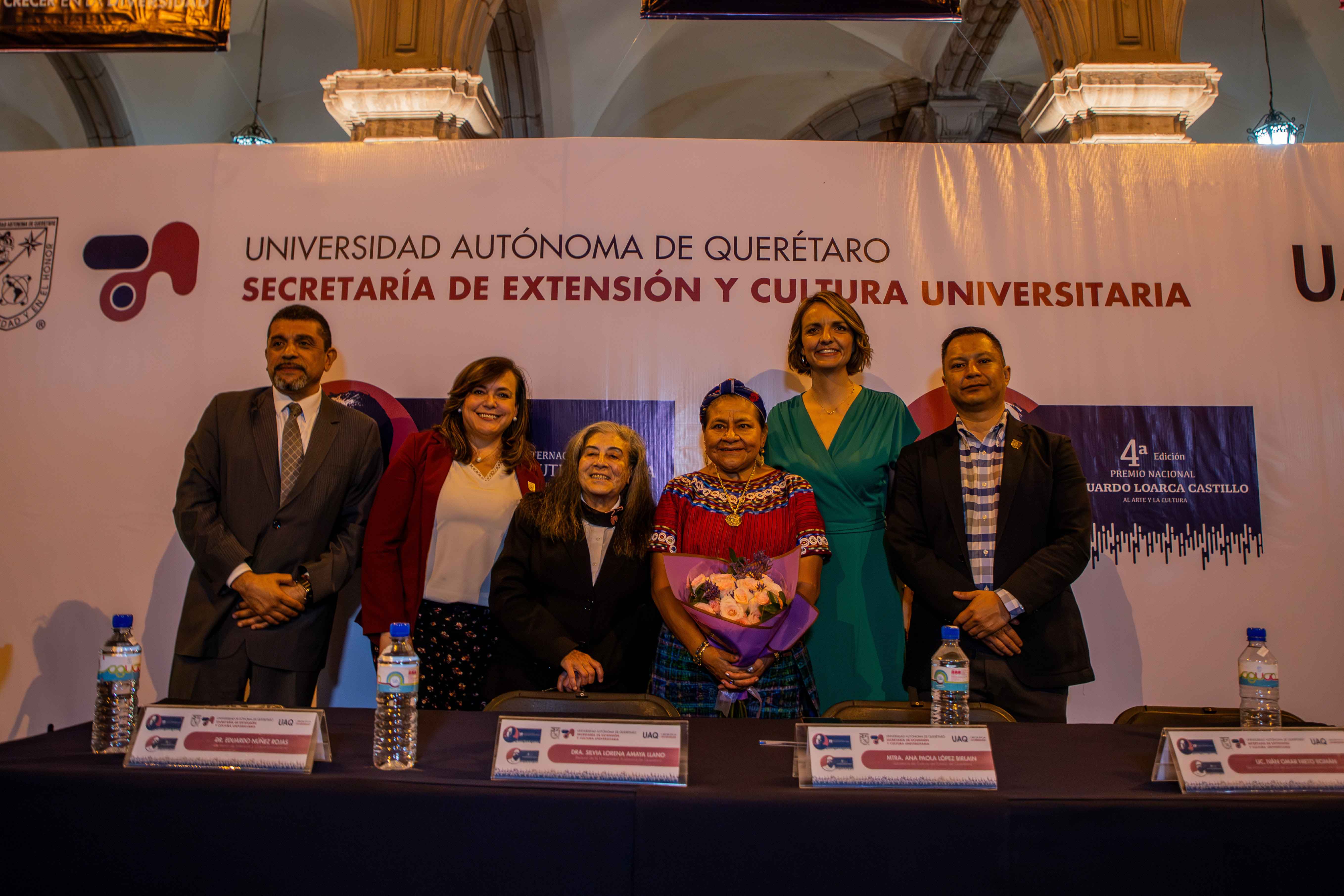 En el histórico Patio Barroco de la Universidad Autónoma de Querétaro (UAQ), la Dra. Rigoberta Menchú Tum, ganadora del Premio Nobel de la Paz en 1992, y la pianista Mtra. Guadalupe Parrondo, reconocida como Patrimonio Vivo de la Ciudad de México, recibieron destacados galardones de manos de la rectora de la UAQ, Dra. Silvia Amaya Llano. Menchú fue honrada con el Premio Internacional “Hugo Gutiérrez Vega” a las Artes y Humanidades, mientras que Parrondo fue distinguida con el Premio Nacional “Eduardo Loarca Castillo” al Arte y la Cultura.