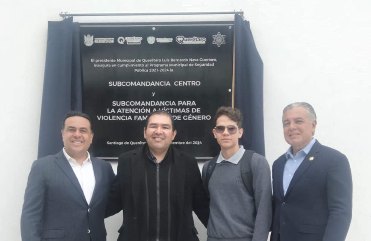 Durante la presentación de las instalaciones de la Subcomandancia Centro y la Subcomandancia para la Atención a Víctimas de Violencia Familiar y de Género en Querétaro, las organizaciones SOS Discriminación Internacional Querétaro y el Observatorio Juvenil por la No Discriminación Querétaro (OJQ) otorgaron un reconocimiento al presidente municipal, Luis Bernardo Nava Guerrero, al secretario de Seguridad Pública del Municipio de Querétaro (SSPMQ), Juan Luis Ferrusca Ortiz, y a la directora de Atención a Víctimas de Violencia Familiar y de Género, Adriana García Montes, por su trabajo en la creación y apoyo a esta dirección con perspectiva de no discriminación.