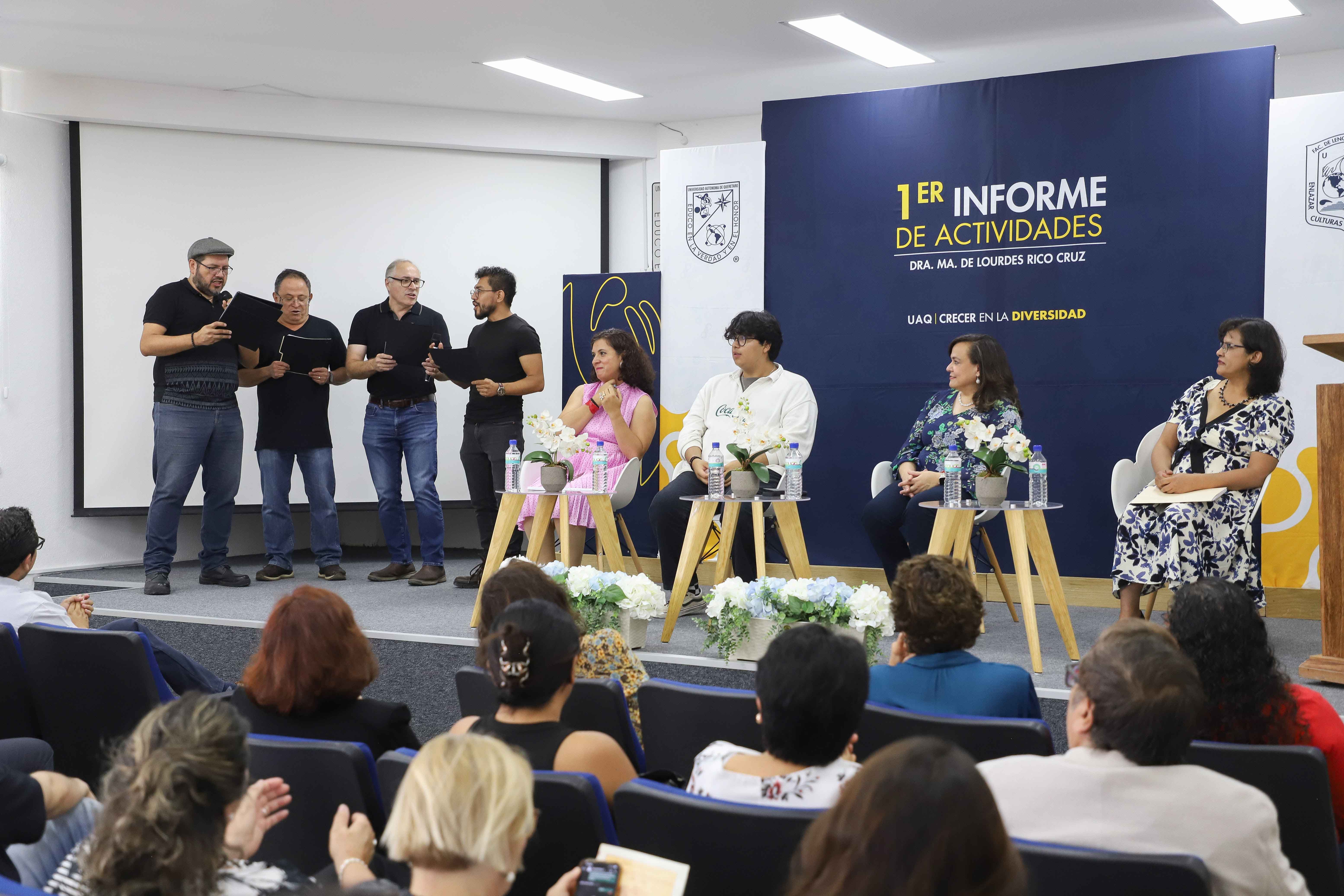 En sesión extraordinaria del Consejo Académico, la directora de la Facultad de Lenguas y Letras (FLL) de la Universidad Autónoma de Querétaro, Dra. Lourdes Rico Cruz, presentó su primer informe de actividades, acompañada por la rectora, Dra. Silvia Amaya Llano, y miembros de la comunidad universitaria.