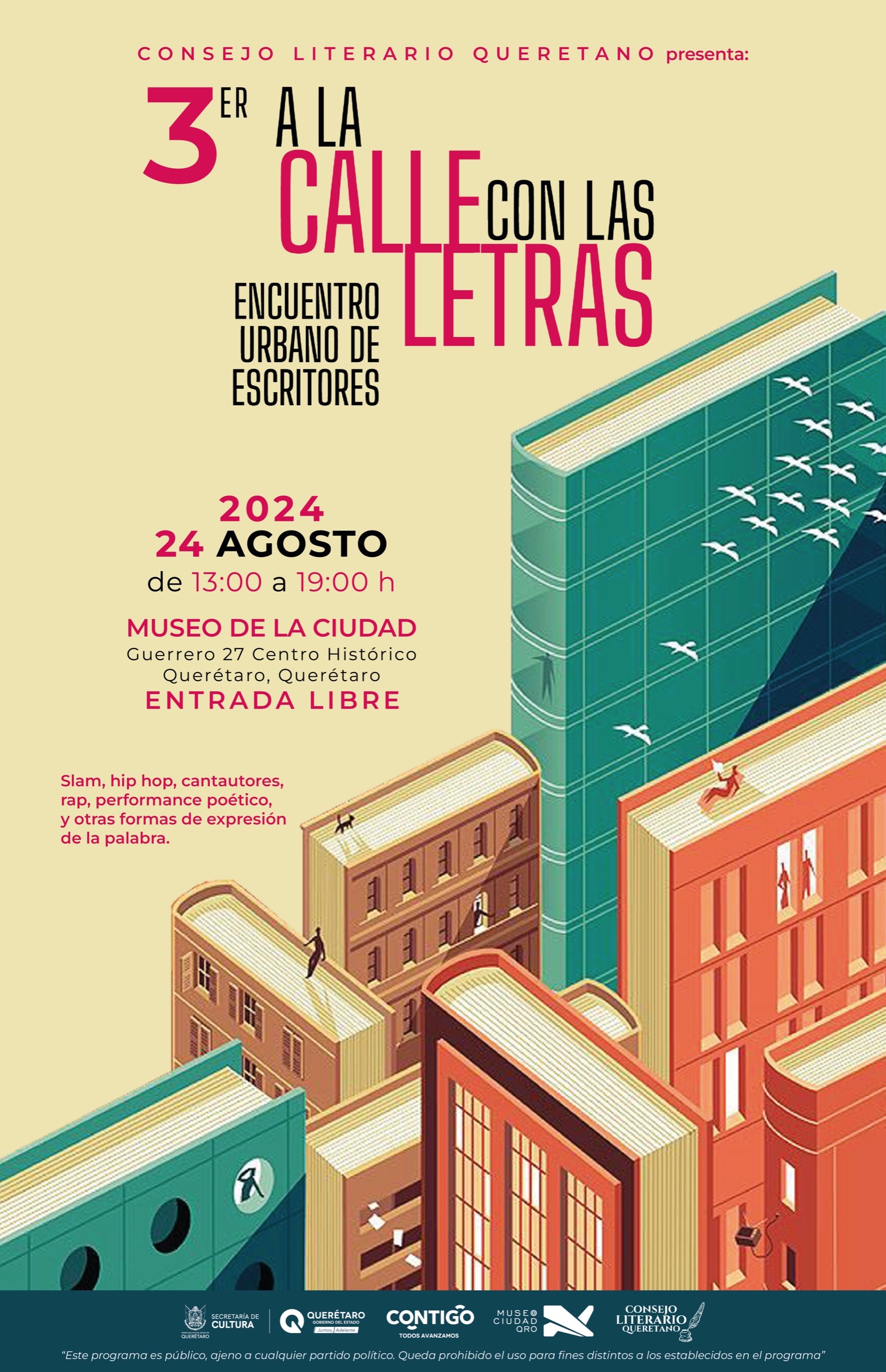 El próximo sábado 24 de agosto el Museo de la Ciudad será sede de la tercera edición del Encuentro Urbano de Escritores ‘A la Calle con las Letras’, promovido y organizado por el Consejo Literario Queretano, con apoyo de la Secretaría de Cultura del estado.