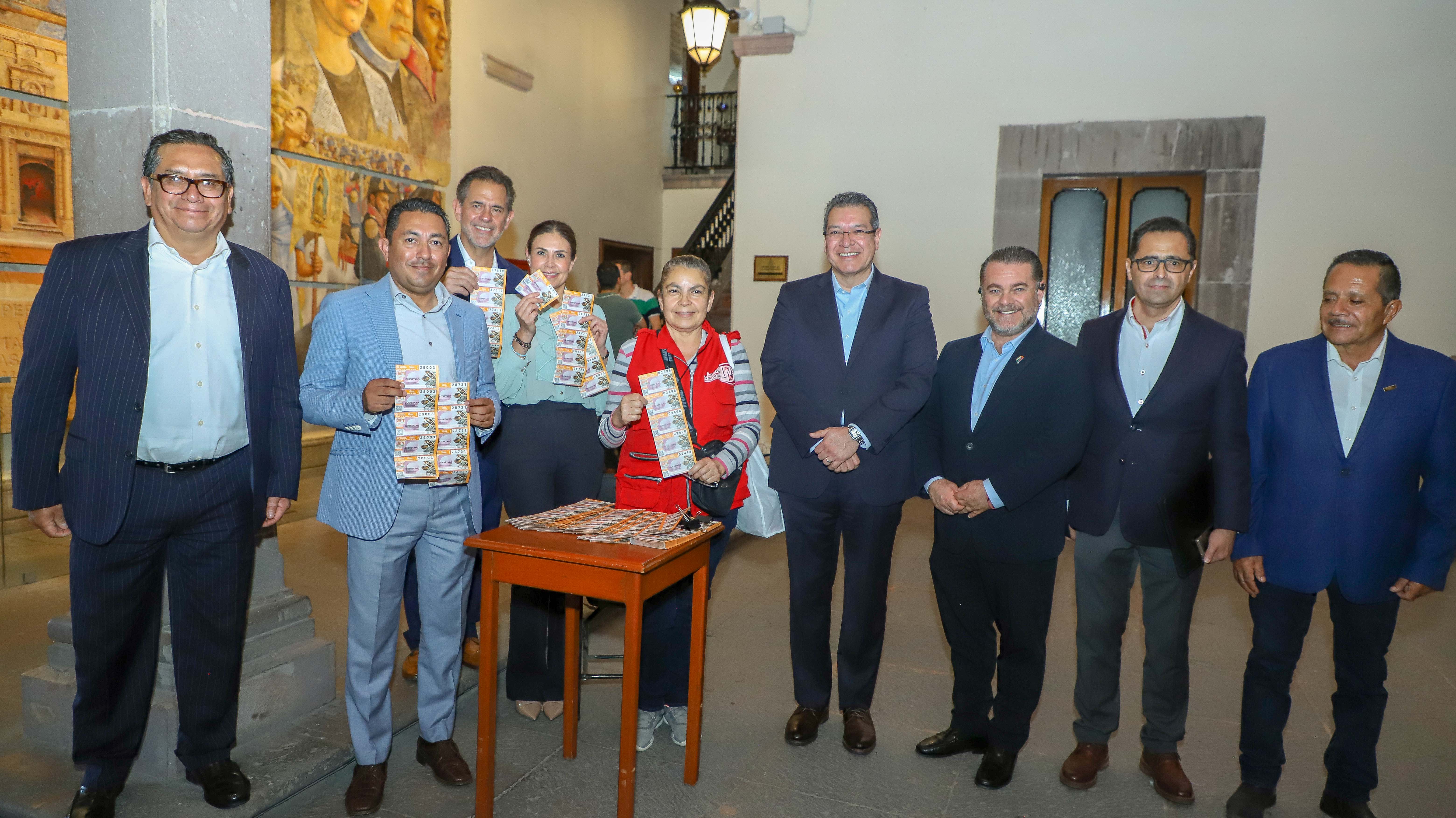 La titular de la Secretaría de Turismo del estado, Adriana Vega Vázquez Mellado, en compañía del director general de la Lotería Nacional para la Asistencia Pública, Marco Antonio Mena Rodríguez, develó el billete conmemorativo de "Querétaro, Capital Iberoamericana de la Gastronomía de Encuentro".