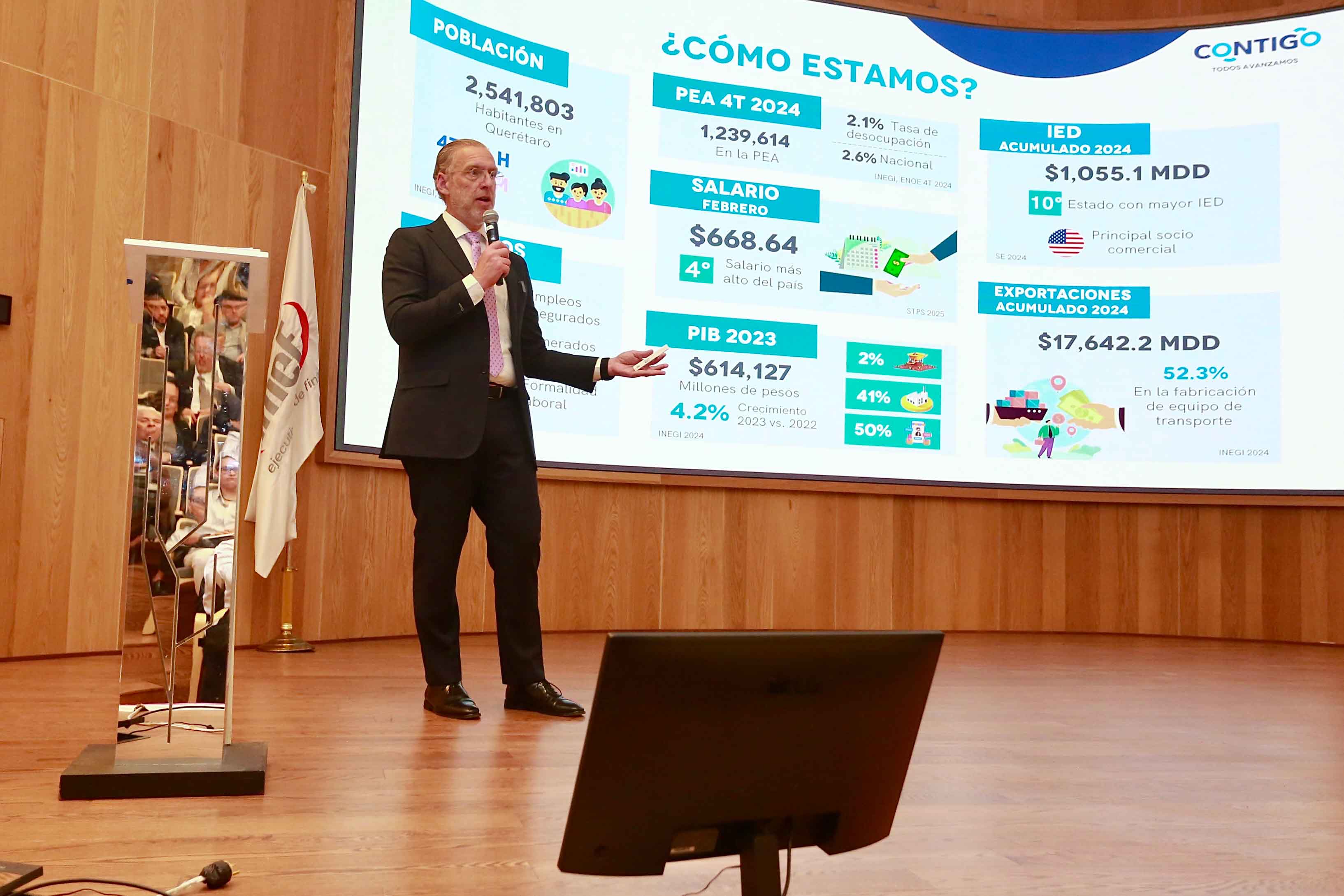 Frente a un mundo incierto, el estado se está convirtiendo en un lugar de certezas, porque aquí, la confianza no es un discurso, es una política pública y los resultados están a la vista, aseguró el titular de la Secretaría de Desarrollo Sustentable (SEDESU), Marco Antonio Del Prete Tercero, durante su ponencia “Querétaro, motor industrial y financiero ante la incertidumbre mundial”, en el XX Simposio Nacional IMEF.