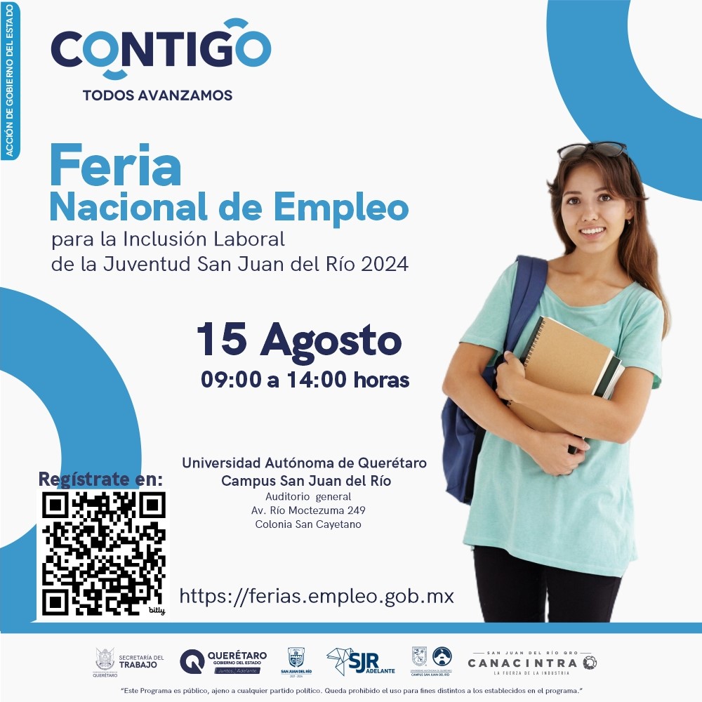 Con la finalidad de impulsar oportunidades laborales para las juventudes sanjuanenses, la Secretaría del Trabajo (ST) prepara la Feria Nacional de Empleo para la Inclusión Laboral de la Juventud, en la que se promoverán mil 100 vacantes en 44 empresas de la región, el próximo 15 de agosto en la Universidad Autónoma de Querétaro (UAQ) Campus San Juan del Río, en un horario de 9:00 a 14:00 horas.