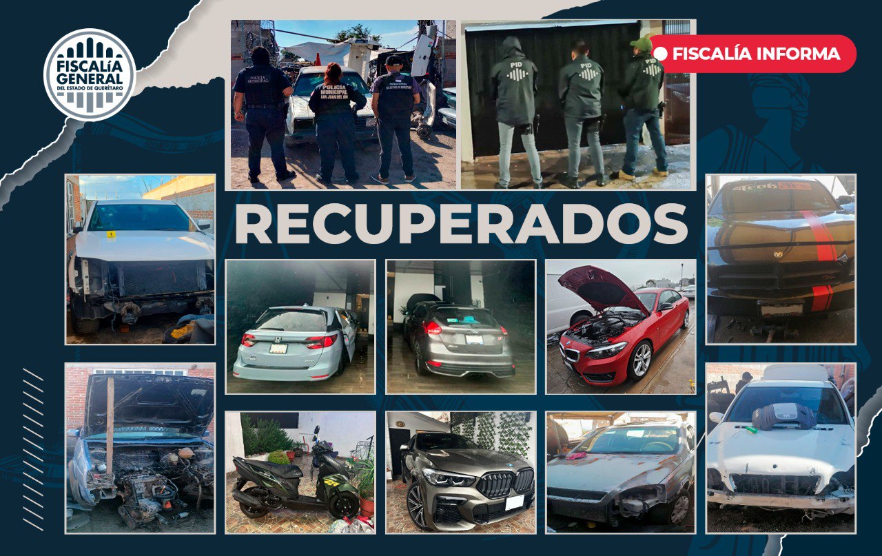 La Fiscalía General del Estado ha logrado recuperar un total de 10 automóviles y una motocicleta en el marco de dos investigaciones distintas relacionadas con el robo de vehículos. Las diligencias de cateo se llevaron a cabo en los municipios de Querétaro y San Juan del Río, y todas las unidades recuperadas contaban con reporte de robo o alteración en sus números de identificación.