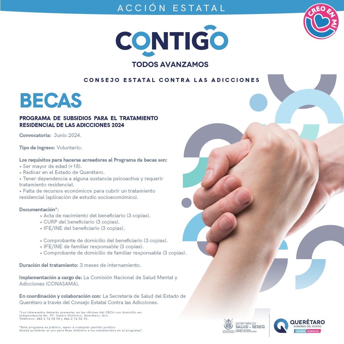 La Secretaría de Salud (SESA) del estado de Querétaro, a través del Consejo Estatal Contra las Adicciones (CECA), informa que a través del Programa de Subsidios para el Tratamiento Residencial de las Adicciones 2024, se ofrecen 10 becas de internamiento en Establecimientos Residenciales de Atención y Tratamiento de Adicciones reconocidos por la Comisión Nacional de Salud Mental y Adicciones (CONASAMA).