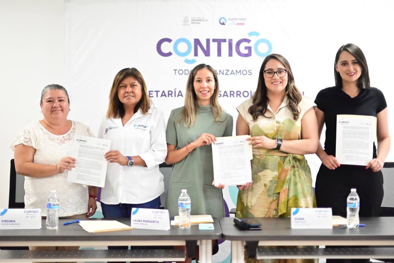 La secretaria de Desarrollo Social del Estado de Querétaro (SEDESOQ), Diana Yadira Pérez Mejía; y la secretaria de la Mujer de la capital, Laura Margarita Garibay Barajas, firmaron un convenio de colaboración con el que buscan beneficiar a las alumnas de la Universidad de las Mujeres a través de un apoyo económico para el pago de su colegiatura.