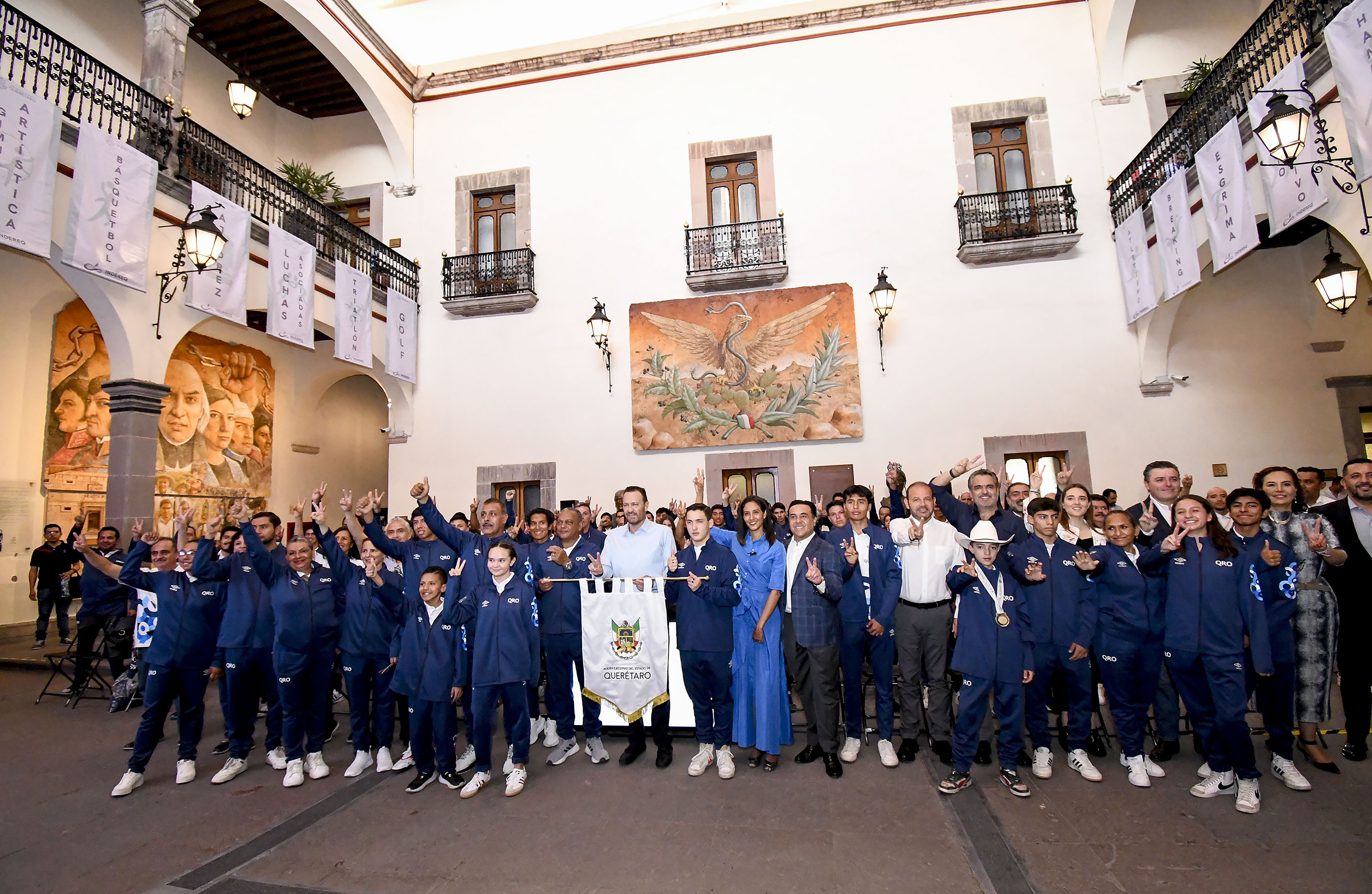 En el patio principal de Palacio de Gobierno se dieron cita las y los competidores que conforman la delegación estatal, que en esta ocasión calificó en 36 disciplinas, tres más que el año 2023; en este marco, la titular del INDEREQ reportó que arrancaron su participación la semana pasada con ocho medallas de la disciplina de rodeo, la primera la obtuvo Salvador Garduño.