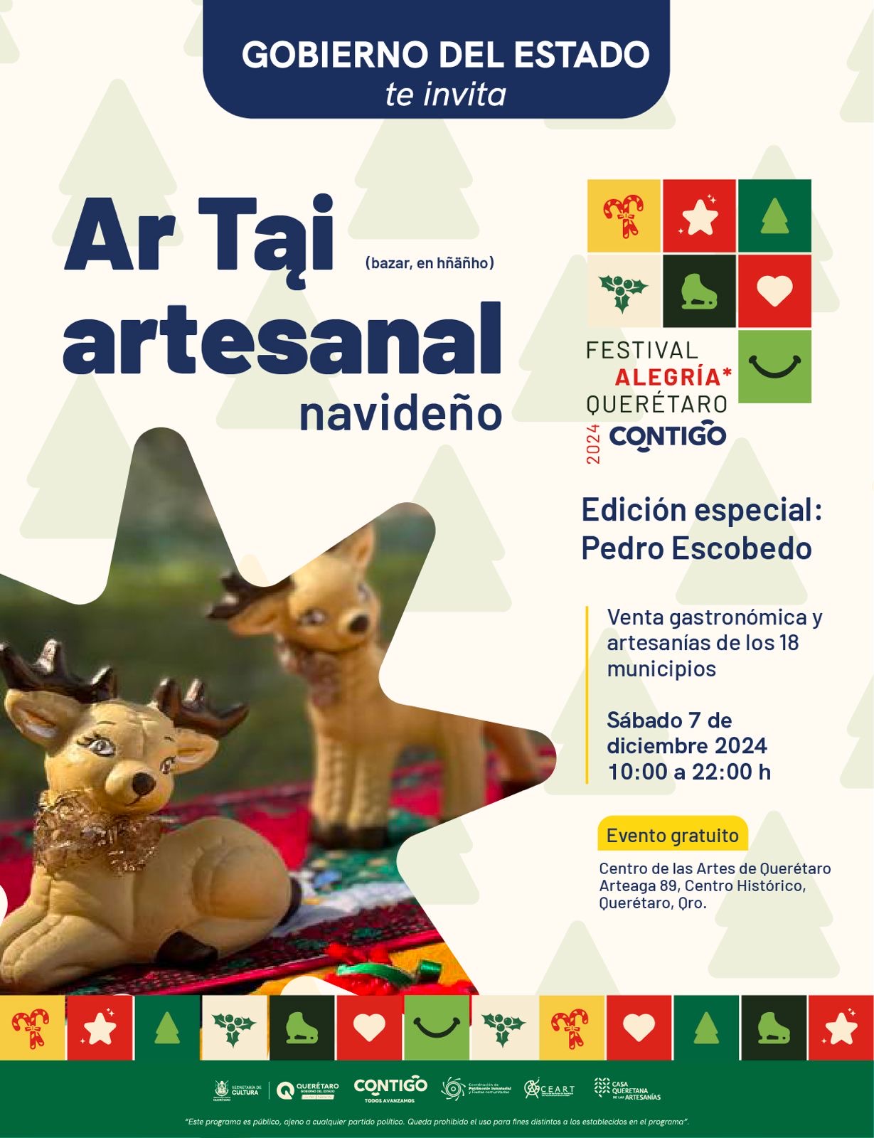 Con el objetivo de promover el trabajo de las y los artesanos queretanos, la secretaria de Cultura del estado, Ana Paola López Birlain, anunció la décimo sexta edición del Ar Tai, en esta ocasión ambientado en la Navidad 2024 y dedicado al municipio de Pedro Escobedo, se llevará a cabo el sábado 7 de diciembre en el Centro de las Artes de Querétaro.