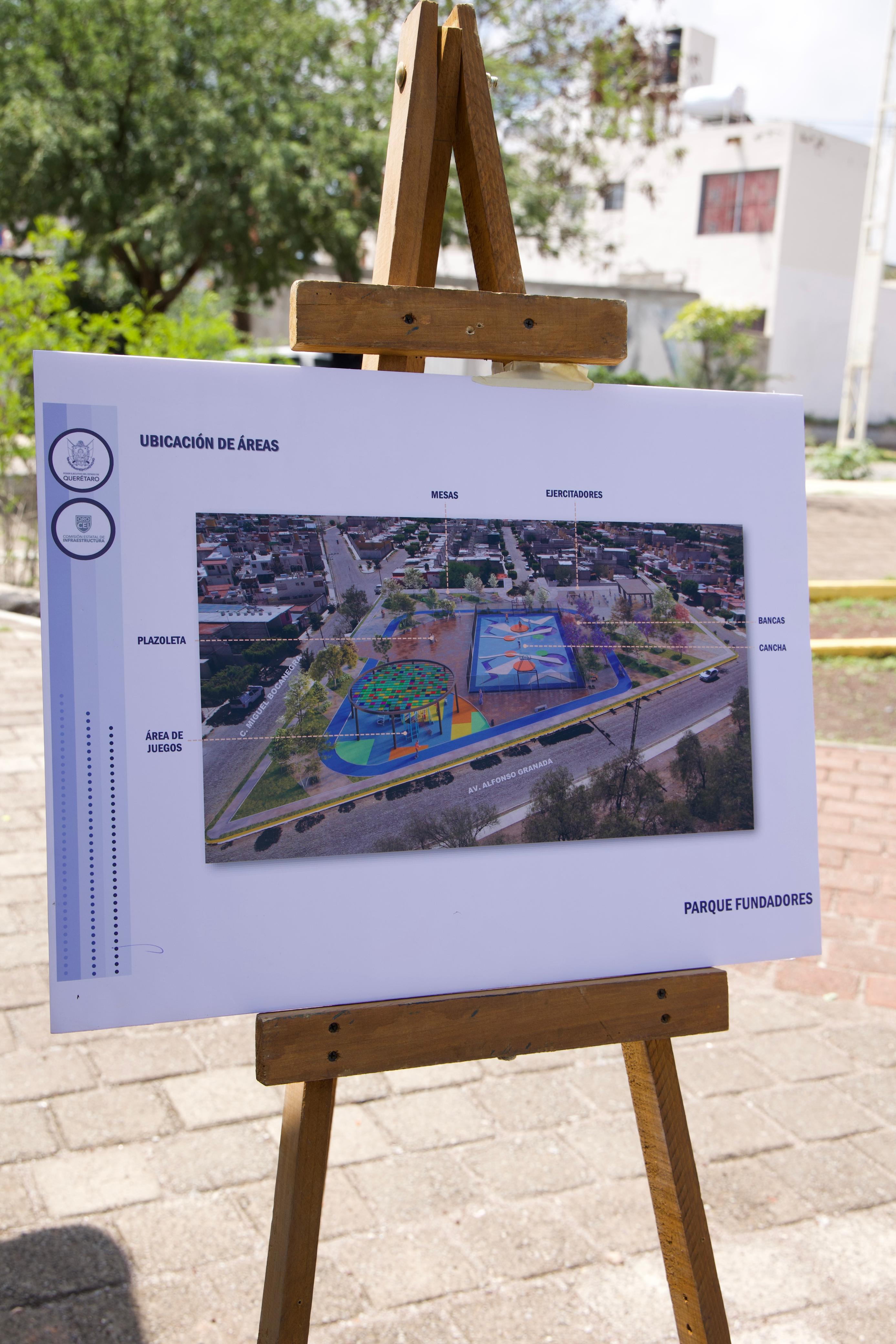 La secretaria de la Juventud (SEJUVE), Virginia Hernández Vázquez, junto al presidente municipal de San Juan del Río, Roberto Carlos Cabrera Valencia, encabezó el anuncio de rehabilitación del Parque Fundadores, para lo cual se hará una inversión estatal de más de cuatro millones de pesos.