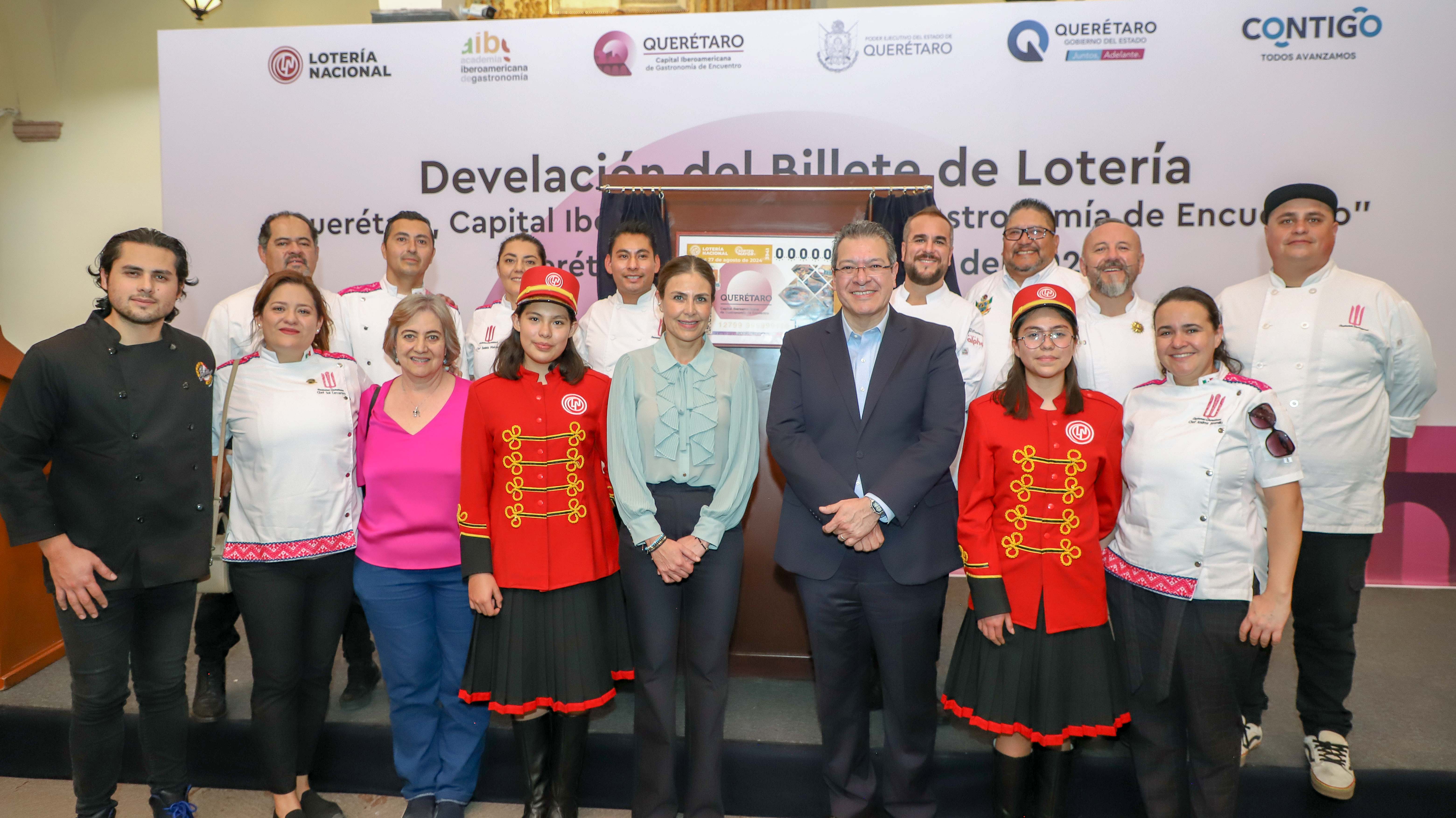 La titular de la Secretaría de Turismo del estado, Adriana Vega Vázquez Mellado, en compañía del director general de la Lotería Nacional para la Asistencia Pública, Marco Antonio Mena Rodríguez, develó el billete conmemorativo de "Querétaro, Capital Iberoamericana de la Gastronomía de Encuentro".