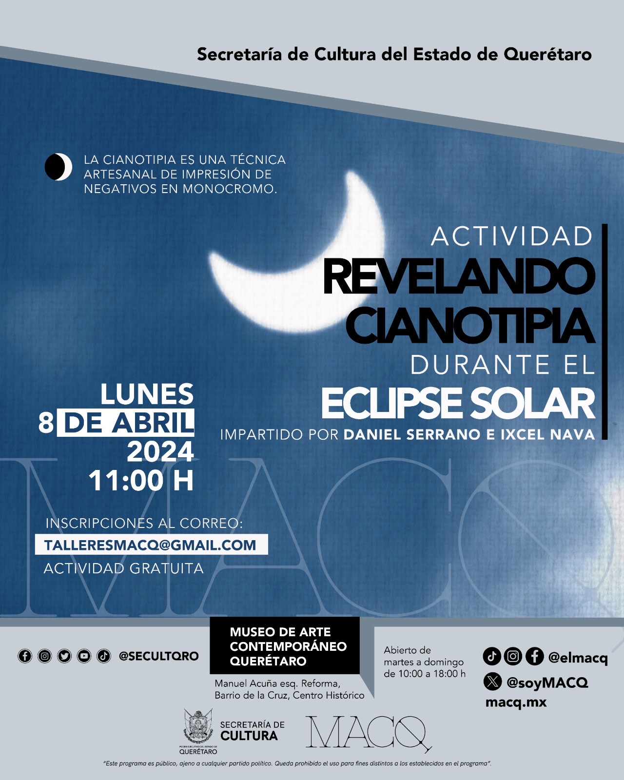 Este lunes 8 de abril, con motivo del eclipse solar, en el Museo de Arte Contemporáneo Querétaro (MACQ), de la Secretaría de Cultura del estado, se llevará a cabo la actividad “Revelando Cianotipia”, a cargo de Daniel Serrano e Ixcel Nava, consistente en revelar diversas cianotipias en formato pequeño durante el fenónemo astronómico.