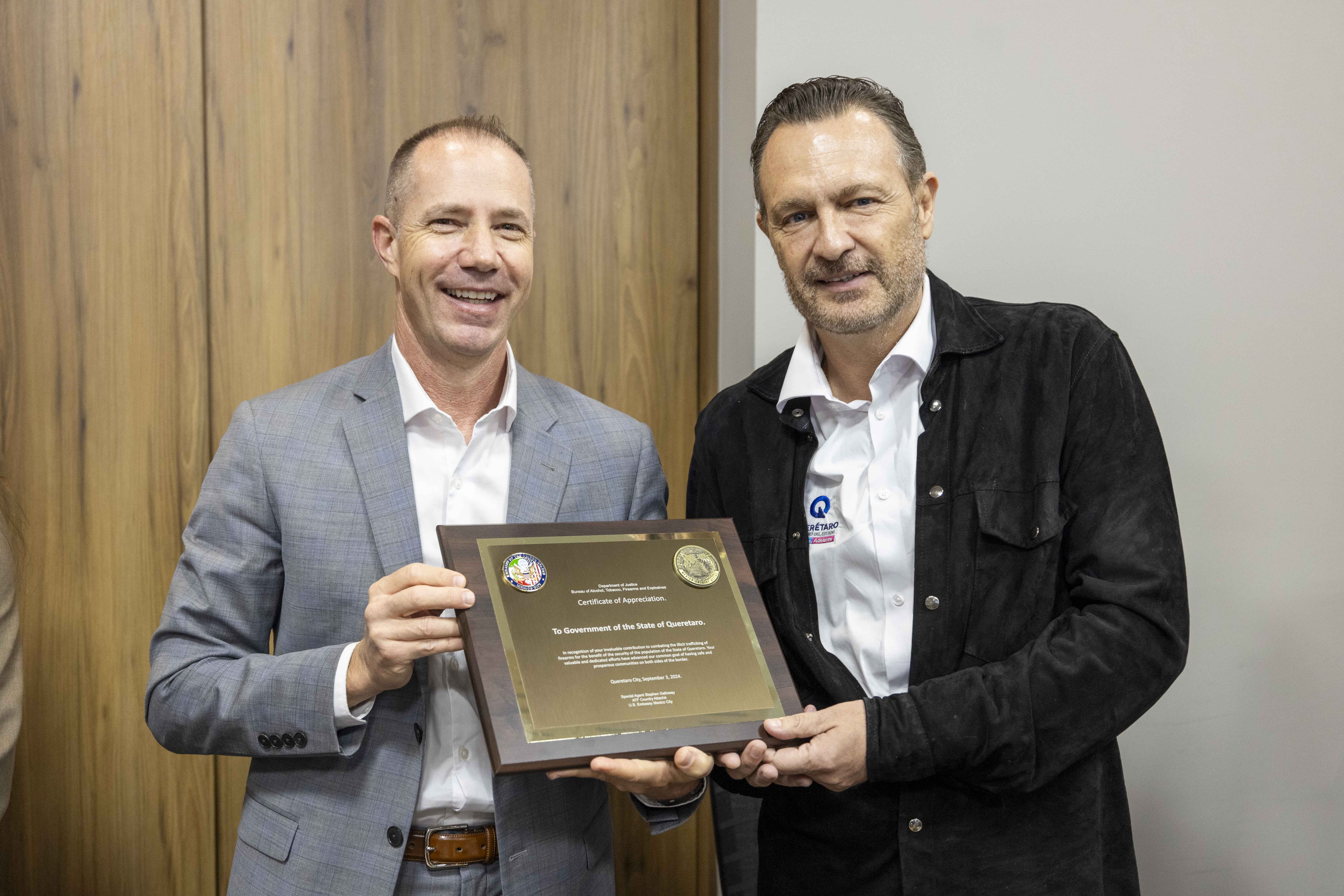 Personal de la Agencia de Alcohol, Tabaco, Armas de Fuego y Explosivos (Bureau of Alcohol, Tobacco, Firearms and Explosives) entregó un reconocimiento al Gobierno del estado de Querétaro por las acciones de intercambio de información que han derivado en resultados positivos en materia de combate al tráfico ilícito de armas de fuego.
