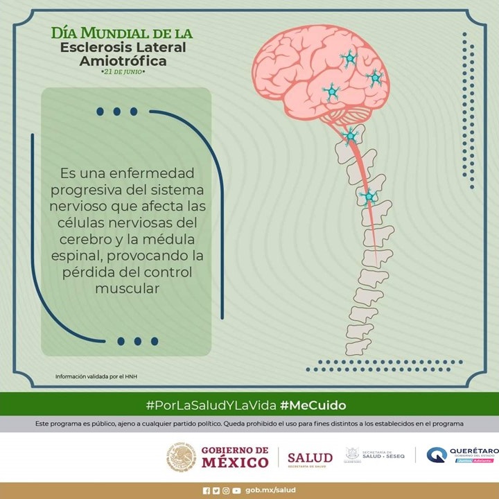 La Secretaría de Salud (SESA) de Querétaro se une a la conmemoración del Día Mundial contra la Esclerosis Lateral Amiotrófica, cada 21 de junio, con el propósito de concienciar sobre esta enfermedad, adherir fuerzas y acrecentar el interés para efectuar investigaciones para incrementar la esperanza de vida de las y los pacientes.