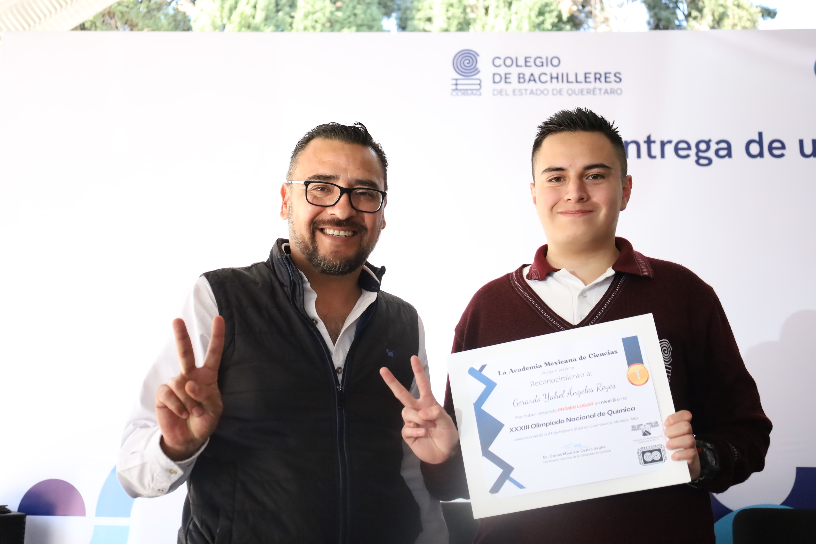 El director general del Colegio de Bachilleres del Estado de Querétaro (COBAQ), León Enrique Bolaño Mendoza, felicitó al estudiante Gerardo Yahel Ángeles Reyes, del plantel 5 Cadereyta, quien obtuvo medalla de oro en la XXXIII Olimpiada Nacional de Química, celebrada en Cuernavaca. Ahí aseguró que dicho resultado es representativo de la educación integral que el Colegio ofrece, y que lo ubica en el seleccionado de México para participar en la 56th International Chemistry Olympiad - IChO 2024, a celebrarse en Arabia Saudita.