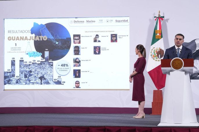Sheinbaum subrayó los avances en Guanajuato, donde los homicidios disminuyeron un 48% en las últimas tres semanas. Además, Marcela Figueroa, secretaria ejecutiva del Sistema Nacional de Seguridad, reportó una disminución del 14% en el promedio diario de homicidios dolosos durante los primeros seis meses de la administración, con marzo de 2025 marcando la cifra más baja desde 2018.