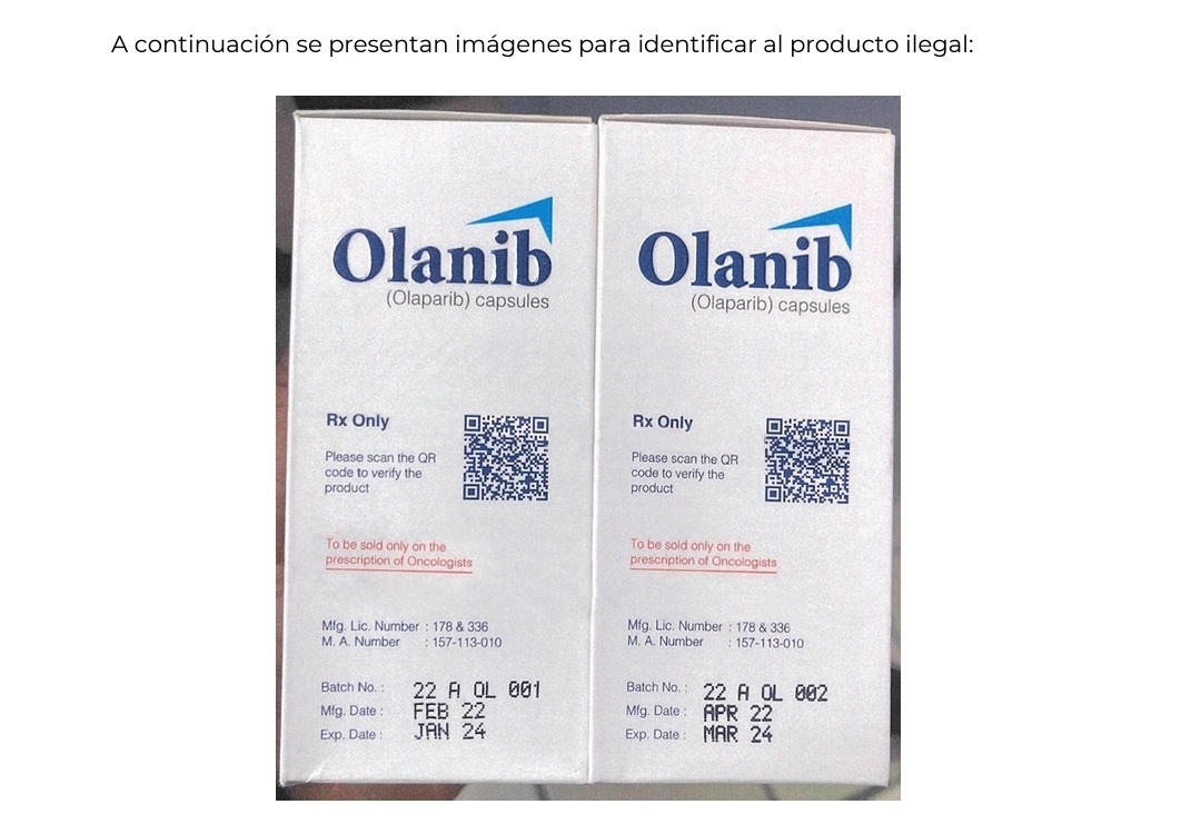 La Secretaría de Salud (SESA) del estado de Querétaro informa que la Comisión Federal para la Protección contra Riesgos Sanitarios (COFEPRIS), alerta a la población sobre la comercialización ilegal del producto Olanib (olaparib) cápsulas, el cual presenta leyendas en idioma inglés y no cuenta con registro sanitario, por lo que no se tiene evidencia de la calidad de los ingredientes ni del proceso de fabricación, almacenamiento y transporte; además, se desconoce si cuenta con estudios que avalen su calidad, seguridad y eficacia, representando un riesgo a la salud de la población.