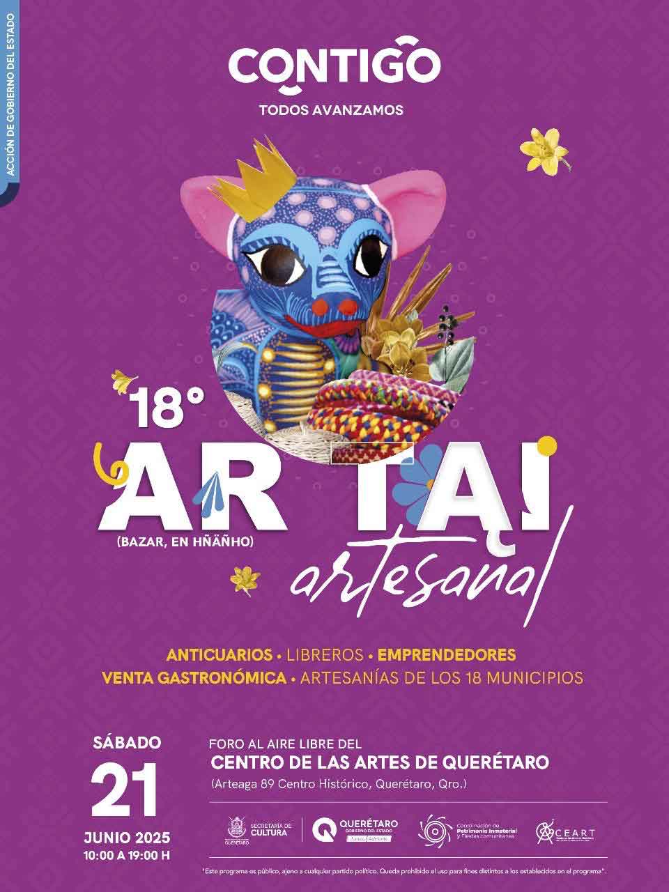 La Secretaría de Cultura del estado (SECULT) invita a visitar la edición número 18 del Bazar Artesanal Ar Tai, que se llevará a cabo este sábado 21 de junio, en el Centro de las Artes de Querétaro (CEART), con la participación de artesanas y artesanos de los 18 municipios de la entidad.