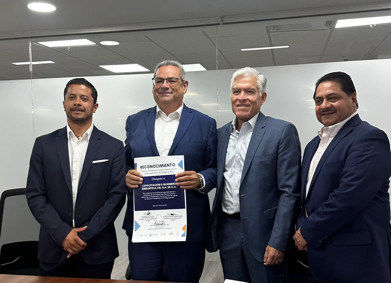 El director de la Agencia de Energía del estado de Querétaro, Mauricio Reyes, encabezó la entrega del reconocimiento “Empresa Confiable para servicios especializados en el cumplimiento del Código de Red”, por las acciones impulsadas por las firmas ROMHER, PAFRA, y CIE en materia de normas y requisitos técnicos que regulan la operación y el funcionamiento de los sistemas eléctricos.
