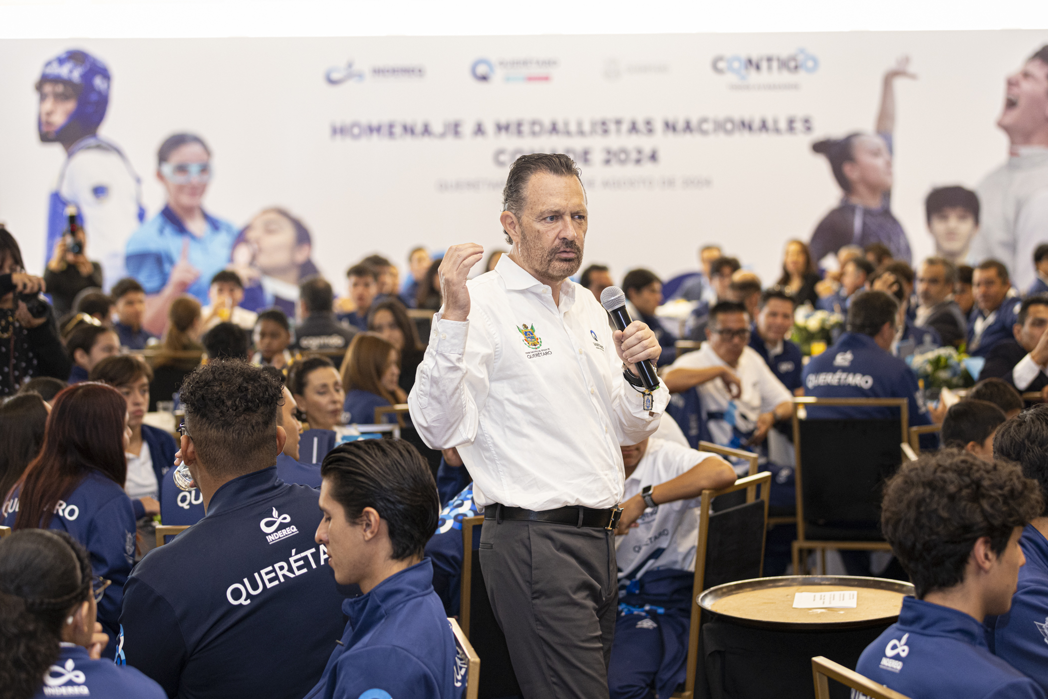 En Querétaro nos empeñamos en detectar, reconocer y potenciar el talento deportivo, afirmó el gobernador, Mauricio Kuri González, al rendir homenaje y entregar reconocimientos a medallistas y entrenadores que participaron en las competencias nacionales de la Comisión Nacional de Cultura Física y Deporte (CONADE) 2024.