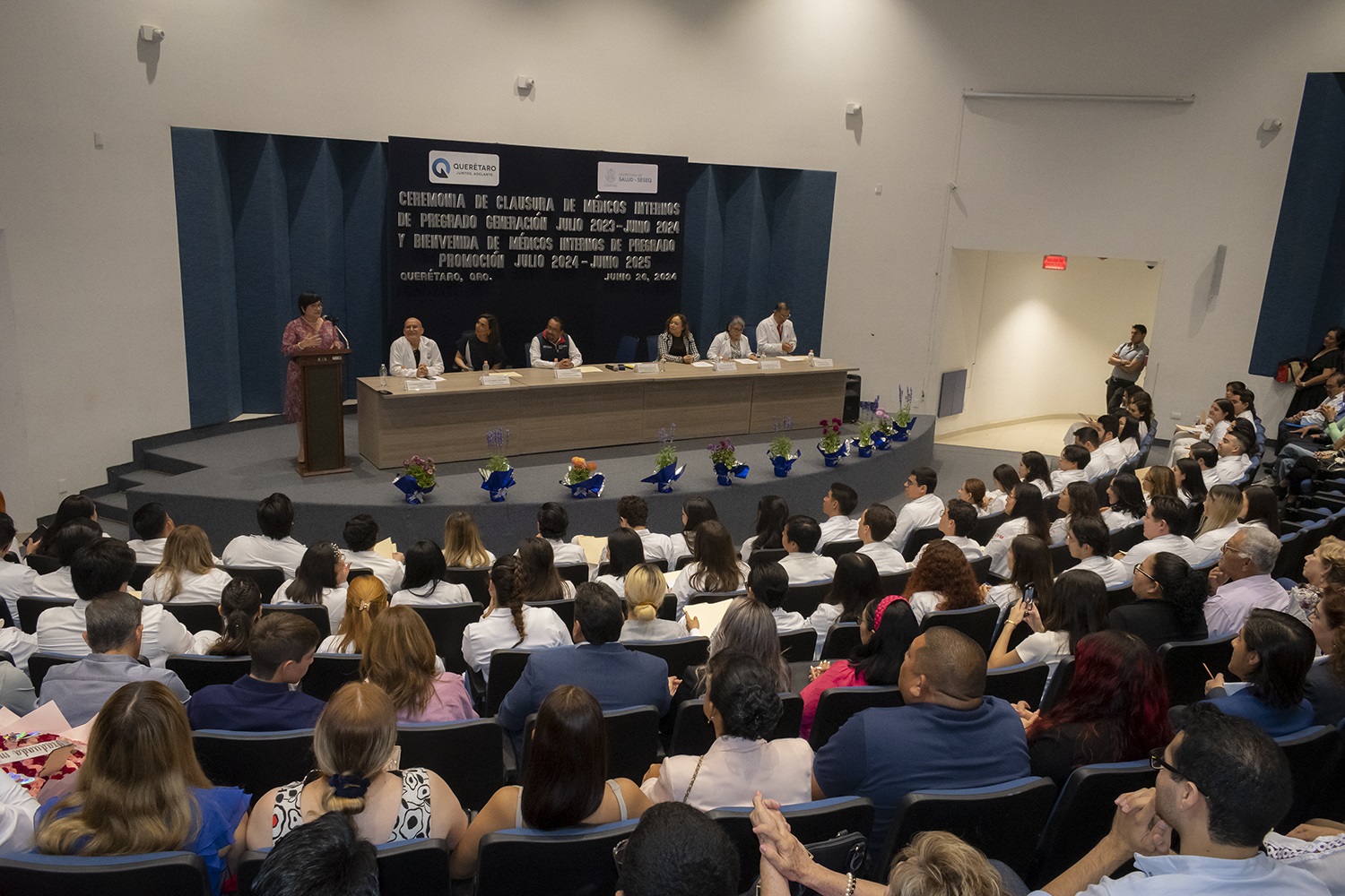 La titular de la Secretaría de Salud del estado, María Martina Pérez Rendón, presidió la ceremonia de Bienvenida y Clausura de Médicos Internos de Pregrado, que se efectuó en el auditorio del Hospital General de Querétaro (HGQ), en la cual se enfatizó la atención brindada a la población queretana durante el año de trabajo en ese espacio.