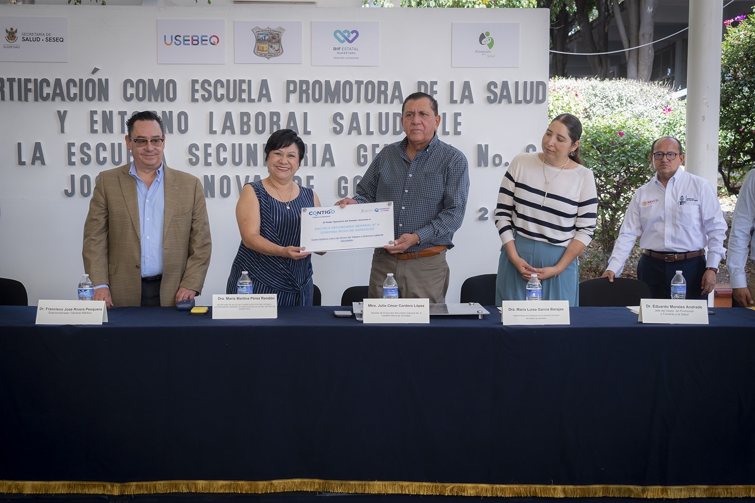 La titular de la Secretaría de Salud (SESA) del estado de Querétaro, María Martina Pérez Rendón, encabezó la ceremonia de entrega de reconocimiento a la Escuela Secundaria General número 6, “Josefina Nova de González”, ubicada en la colonia Hércules en el municipio de Querétaro, como Escuela Promotora de la Salud,y Espacio Laboral Saludable al cumplir con los indicadores federales de la Estrategia Nacional de Salud Escolar.
