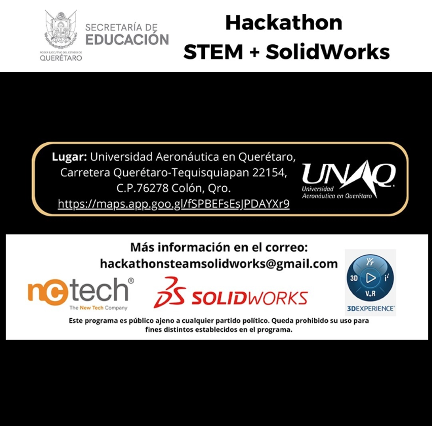 La Secretaría de Educación y las seis universidades estatales invitan al Hackathon STEM + SolidWorks, un evento multidisciplinario donde equipos de tres participantes se reúnen para diseñar y desarrollar soluciones en aplicaciones de diferentes áreas, mediante modelos mecánicos utilizando SolidWorks.