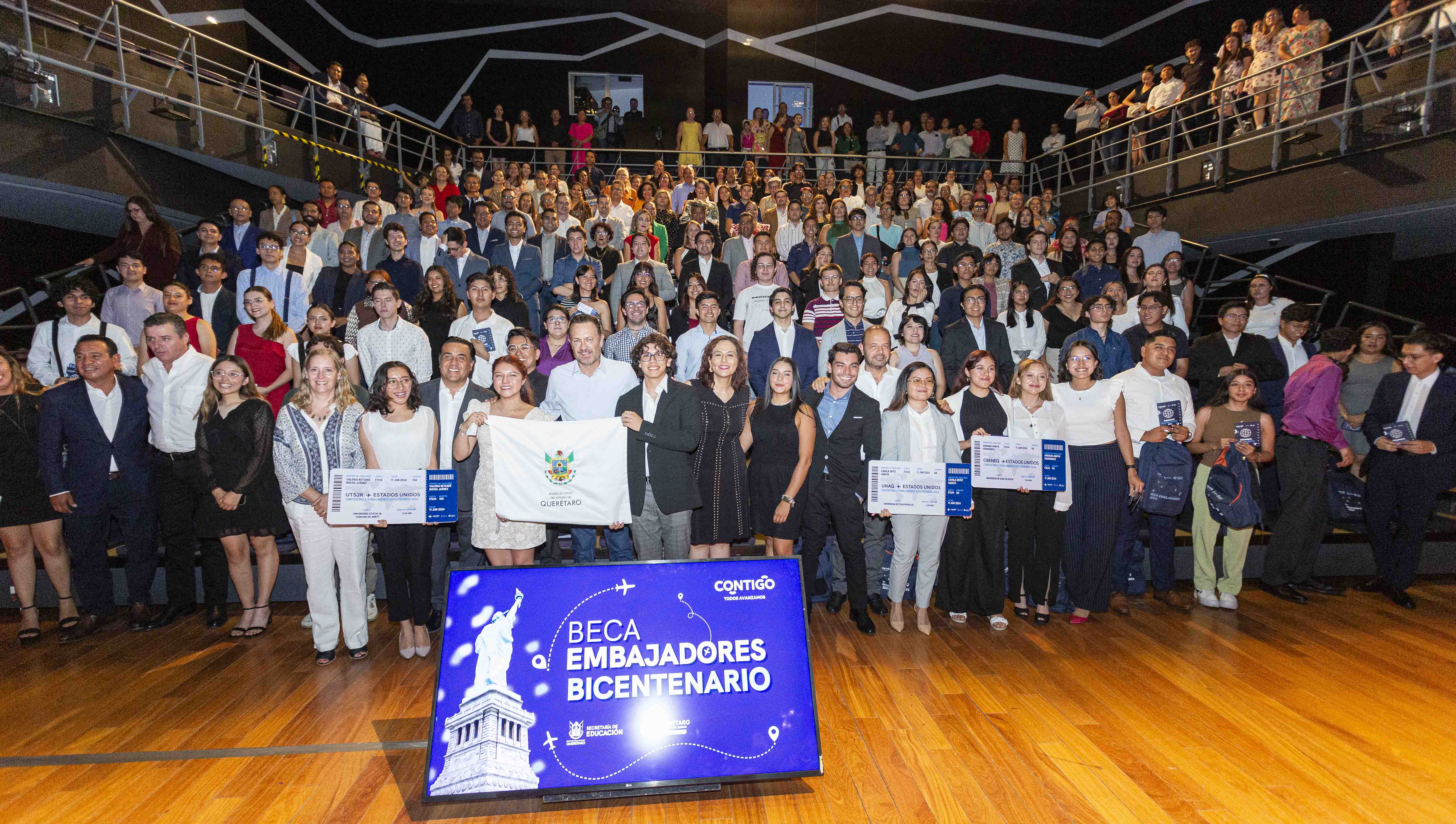 En la ceremonia de abanderamiento, que tuvo lugar en el teatro Experimental del Querétaro Centro de Congresos, las autoridades presentes entregaron de manera simbólica pasaportes y pases de abordar a las y los estudiantes del programa Beca Embajadores Bicentenario 2024.