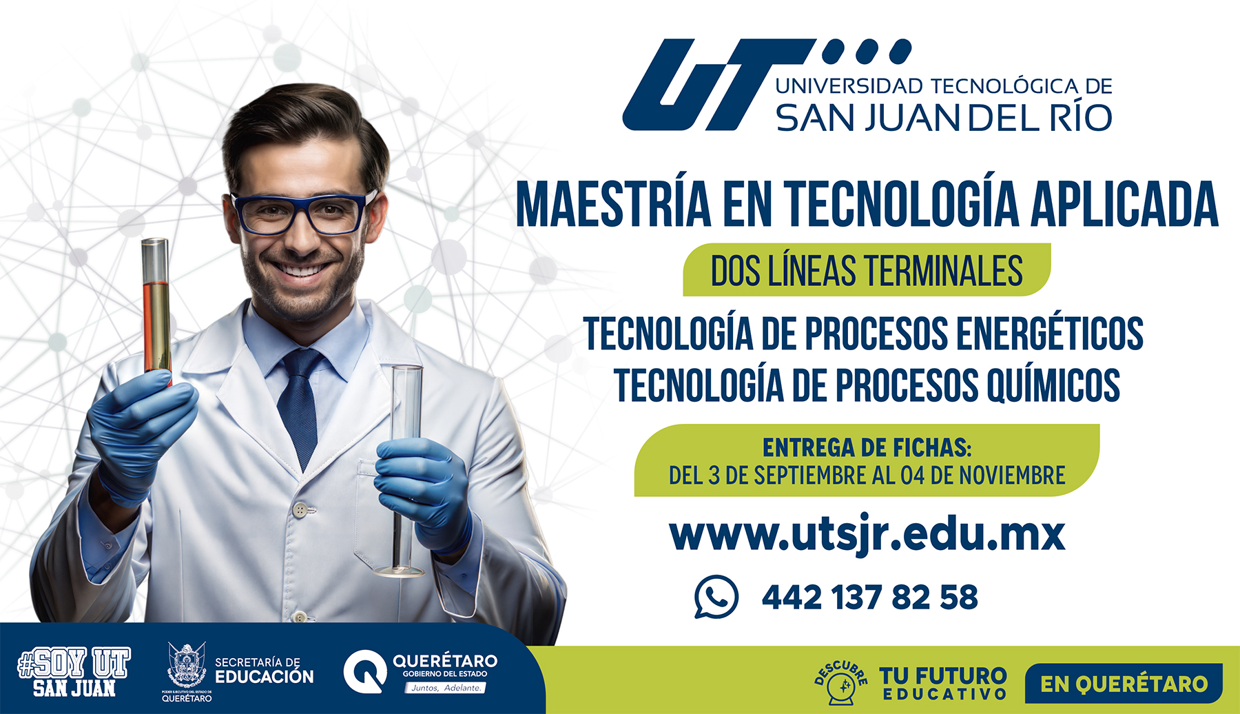 A partir de este martes 3 de septiembre, la Universidad Tecnológica de San Juan del Río abre la plataforma de registro para que los interesados en cursar la Maestría en Tecnología Aplicada obtengan su ficha para el examen de selección a través de la página www.utsjr.edu.mx; además pone a disposición el número 442 137 82 58 para solicitar mayor información vía WhatsApp.