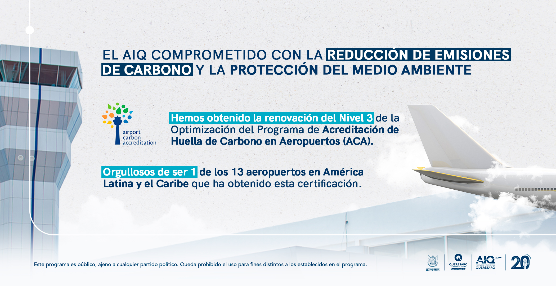 El titular de la Secretaría de Desarrollo Sustentable (SEDESU), Marco Antonio Del Prete Tercero, anunció que el Aeropuerto Internacional de Querétaro (AIQ) cumplió con los requisitos de certificación necesarios para renovar el Nivel 3 de Optimización del Programa de Acreditación de Huella de Carbono en Aeropuertos (ACA).