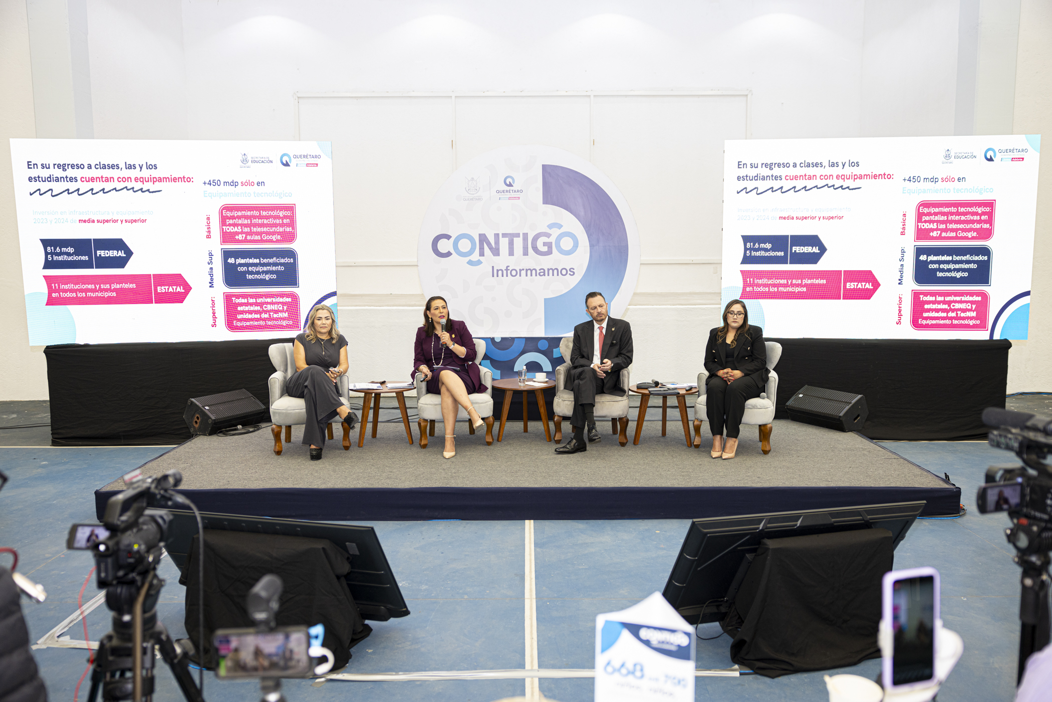 En su exposición, refirió que las y los estudiantes regresan a clases con obras e infraestructura sólida y robusta, muestra de ello es que en este gobierno se han entregado tres obras en materia educativa por semana, entre las que destacan aulas, bardas, módulos sanitarios y modernizaciones integrales de planteles educativos; incluyendo seis escuelas nuevas distribuidas en los municipios de Querétaro, Cadereyta, El Marqués, Corregidora y San Juan del Río.