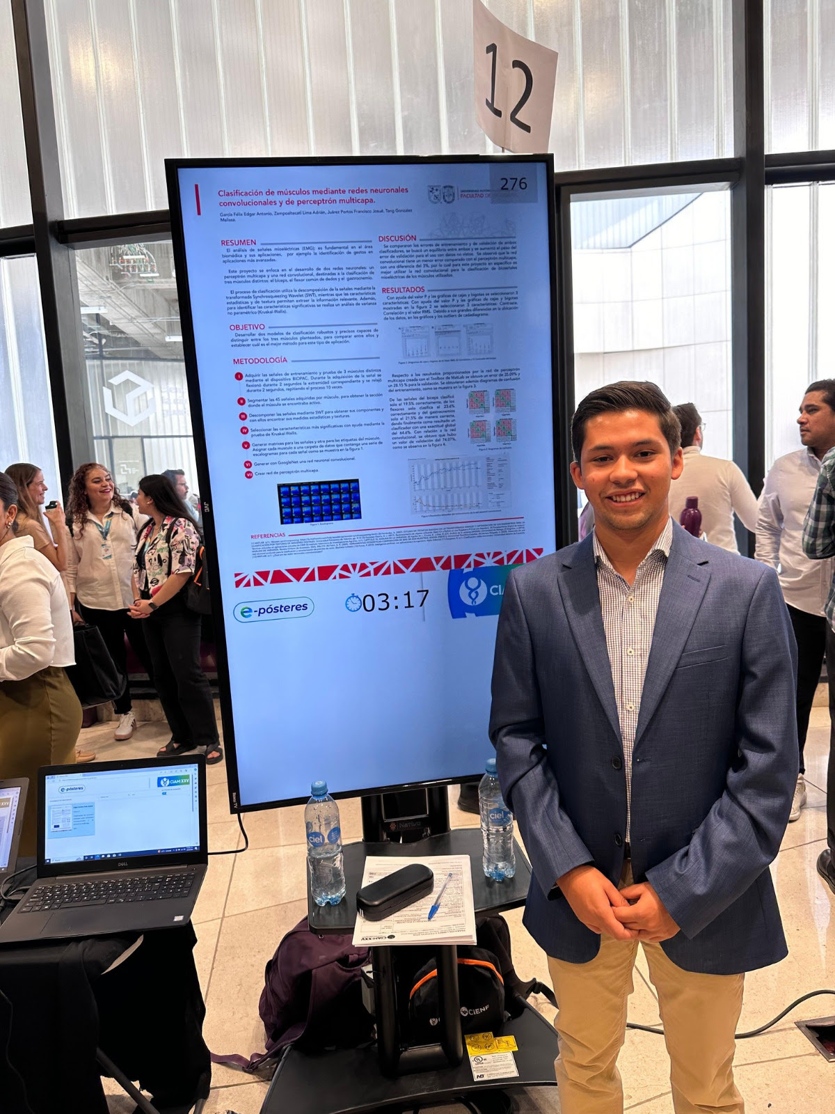 Los universitarios presentaron en este importante encuentro anual en ciencias de la salud, un póster científico sobre cómo resolver fallas en la activación muscular (MAT) de los miembros superiores e inferiores del cuerpo, a través de inteligencia artificial. El proyecto se desarrolló en la materia Técnicas Avanzadas de Procesamiento de Bioseñales, impartida por el Dr. Carlos Andrés Pérez Ramirez y por el Ing. Andrés Emilio Hurtado Pérez.