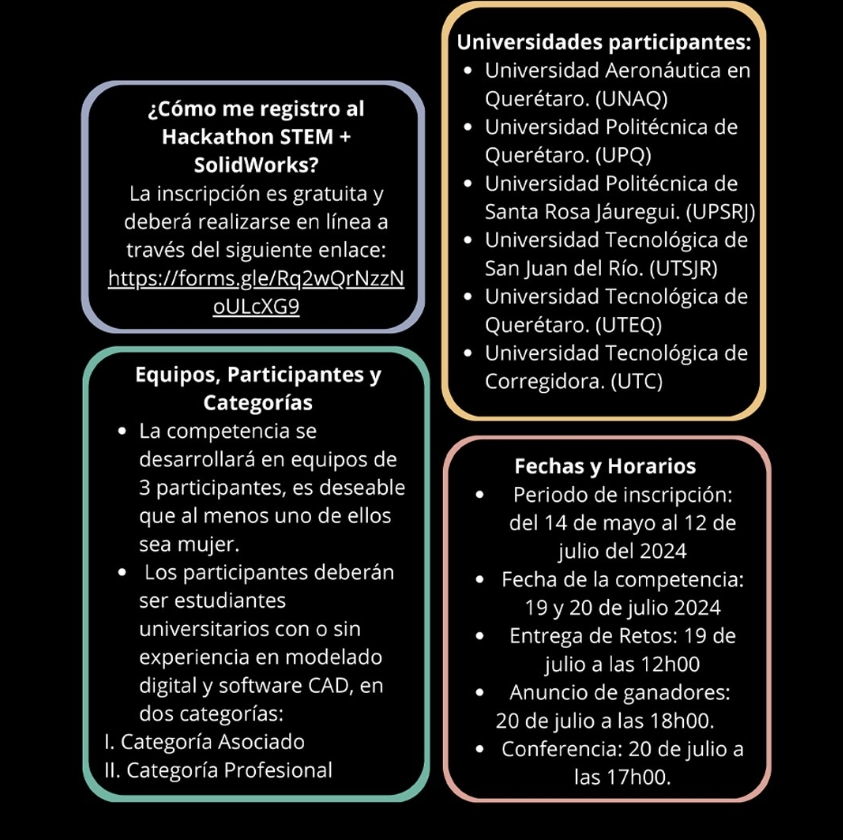 La Secretaría de Educación y las seis universidades estatales invitan al Hackathon STEM + SolidWorks, un evento multidisciplinario donde equipos de tres participantes se reúnen para diseñar y desarrollar soluciones en aplicaciones de diferentes áreas, mediante modelos mecánicos utilizando SolidWorks.