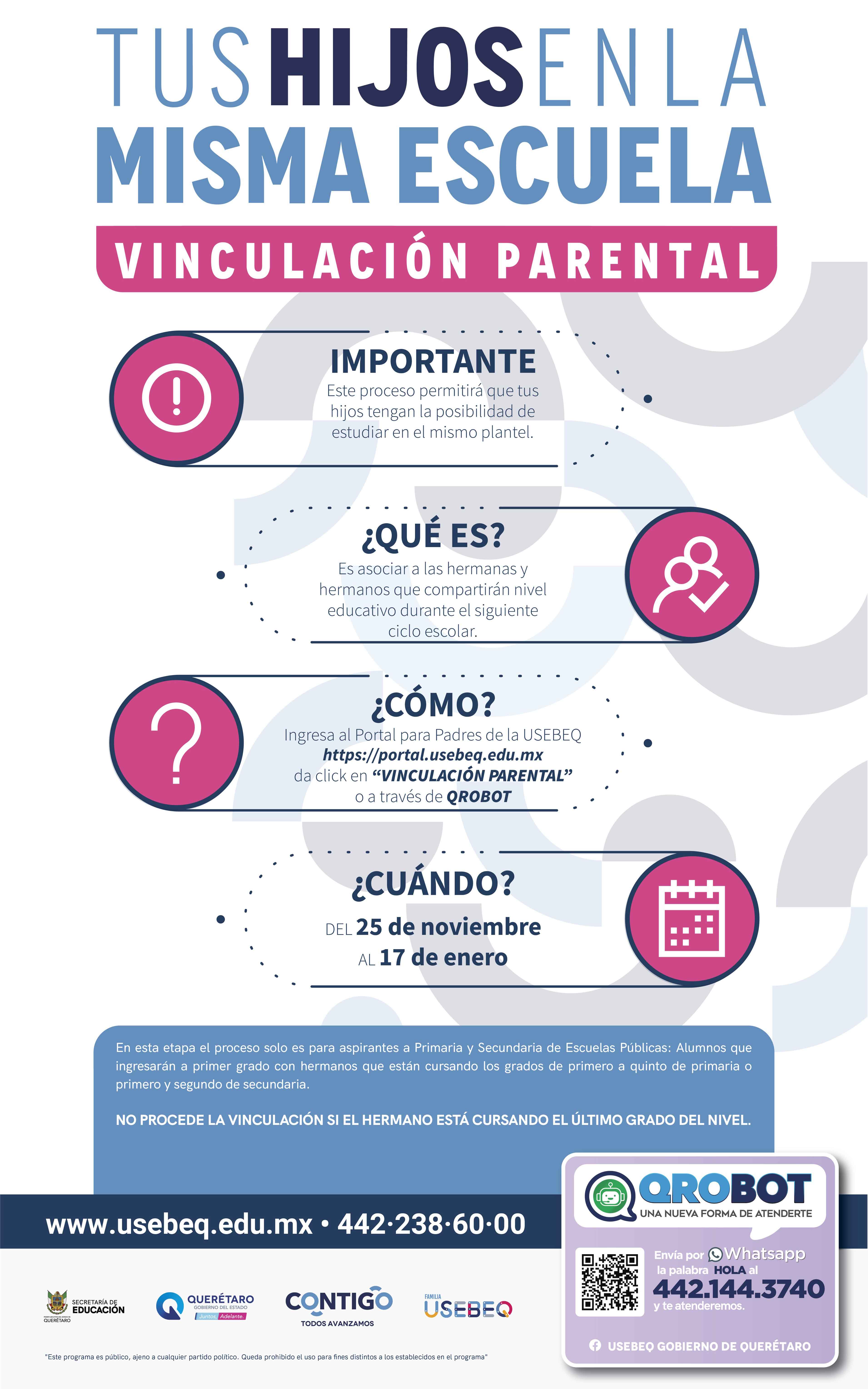 Para realizar este proceso, las madres, padres de familia o tutores deberán ingresar a https://portal.usebeq.edu.mx en la opción de vinculación parental, en donde es indispensable leer el cuadro informativo que da a conocer el proceso para asegurarse de las opciones aplicables a su caso y,posteriormente, seleccionar la opción “Realizar Vinculación”.