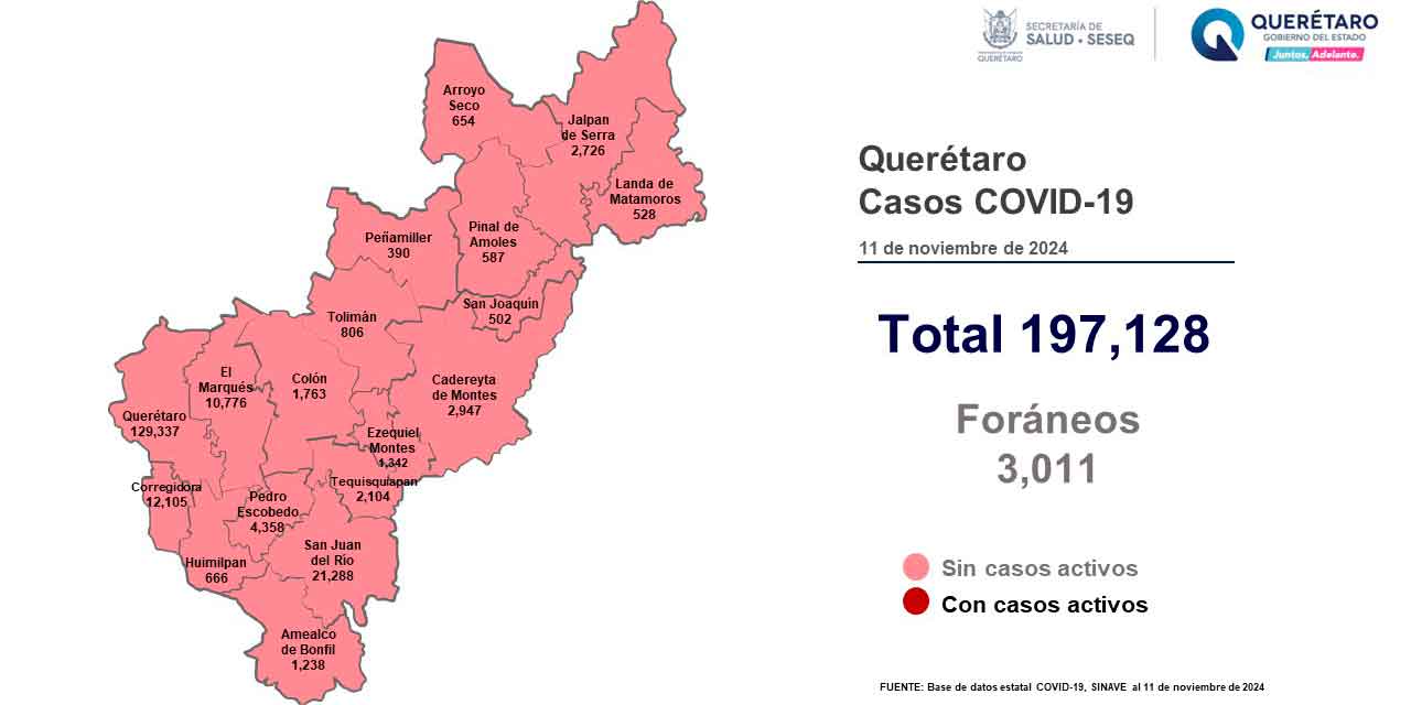 La Secretaría de Salud de Querétaro reportó este lunes cero defunciones por COVID-19, y que en los últimos siete días no se han sumado casos de la enfermedad en el estado. El registro acumulado es de 197 mil 128 casos; 54 por ciento son mujeres y 46 por ciento son hombres.