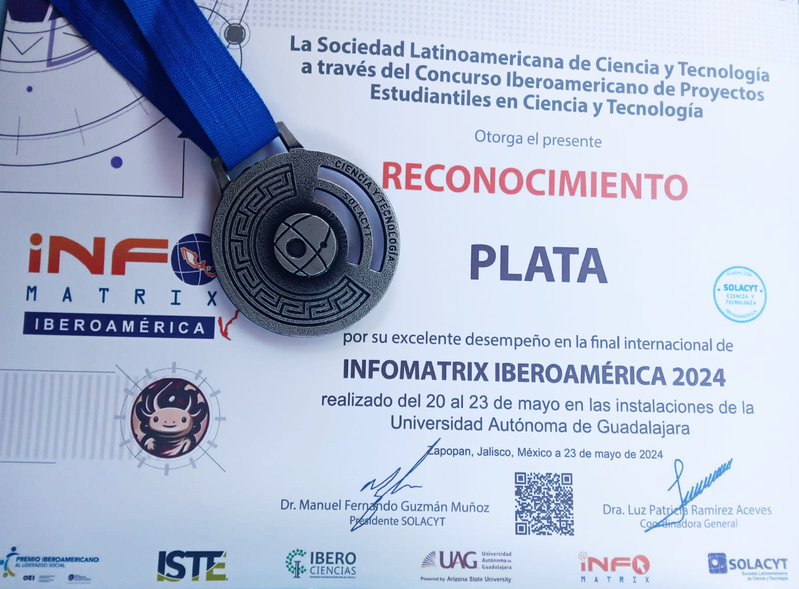 El estudiante del plantel 11 Ezequiel Montes del Colegio de Bachilleres del Estado de Querétaro (COBAQ), obtuvo una medalla de plata, categoría de animación, en la etapa final del XVIII Concurso Iberoamericano de Proyectos Estudiantiles de Ciencia, Tecnología y Emprendimiento INFOMATRIX IBEROAMÉRICA 2024, que se desarrolló en la Universidad Autónoma de Guadalajara (UAG).