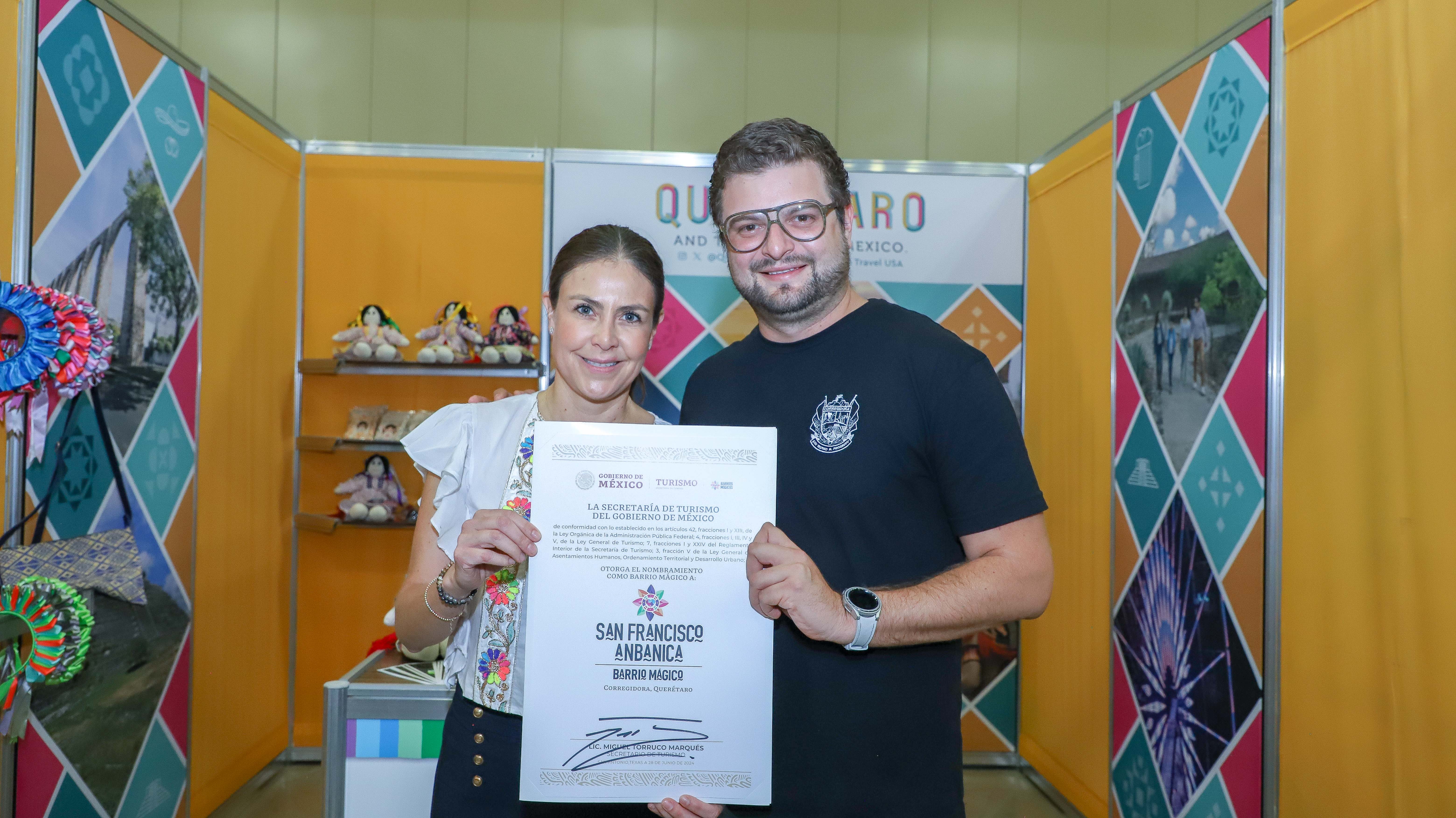 En el marco del Tianguis Internacional de Pueblos Mágicos, que se realiza en la ciudad de San Antonio, Texas, el secretario de Turismo federal, Miguel Torruco Marqués, entregó el nombramiento de “Barrio Mágico” a San Francisco Anbanica, del municipio de Corregidora, a la secretaria de Turismo en el estado, Adriana Vega Vázquez Mellado.