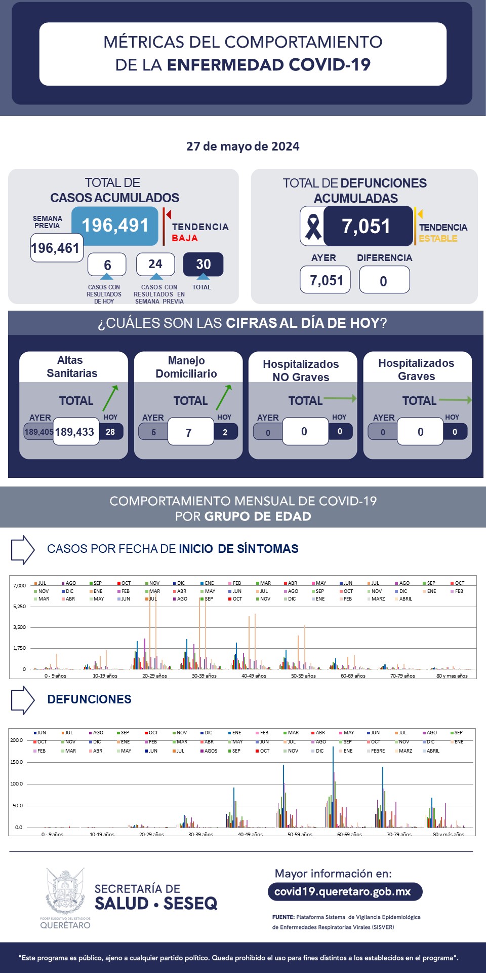 La Secretaría de Salud de Querétaro reportó este lunes cero defunciones por COVID-19 y que en los últimos siete días se han sumado 30 casos de la enfermedad en el estado; se trata de 14 mujeres y 16 hombres. El registro acumulado es de 196 mil 491 casos; 54 por ciento son mujeres y 46 por ciento son hombres.