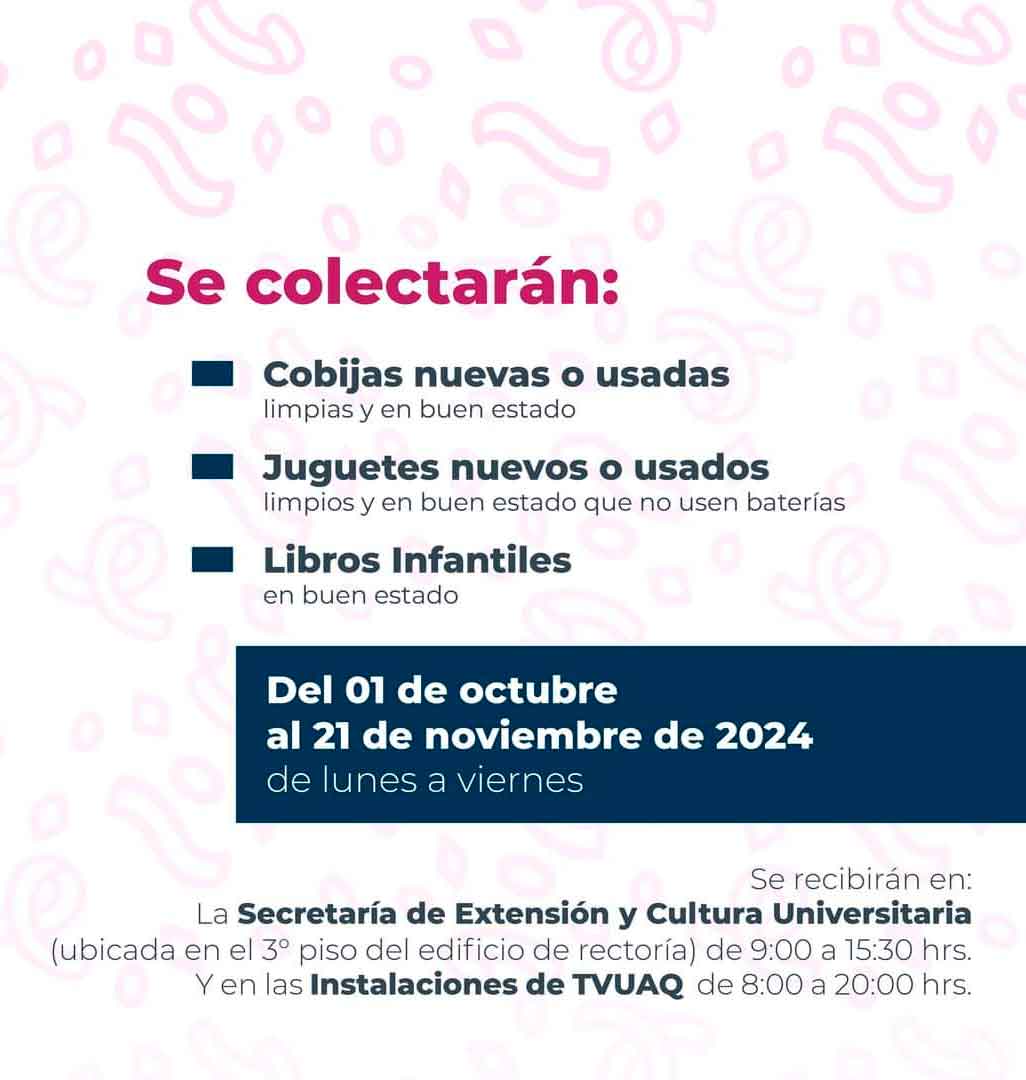 La SECU invita a donar cobijas y ropa en buen estado, juguetes que no requieran pilas y libros infantiles. Las donaciones se recibirán de lunes a viernes en las oficinas de la SECU, ubicadas en el tercer piso del edificio de Rectoría en el Centro Universitario, de 9:00 a 15:30 horas. También podrán entregarse en las instalaciones de TVUAQ, en un horario de 8:00 a 20:00 horas, hasta el 21 de noviembre de 2024.