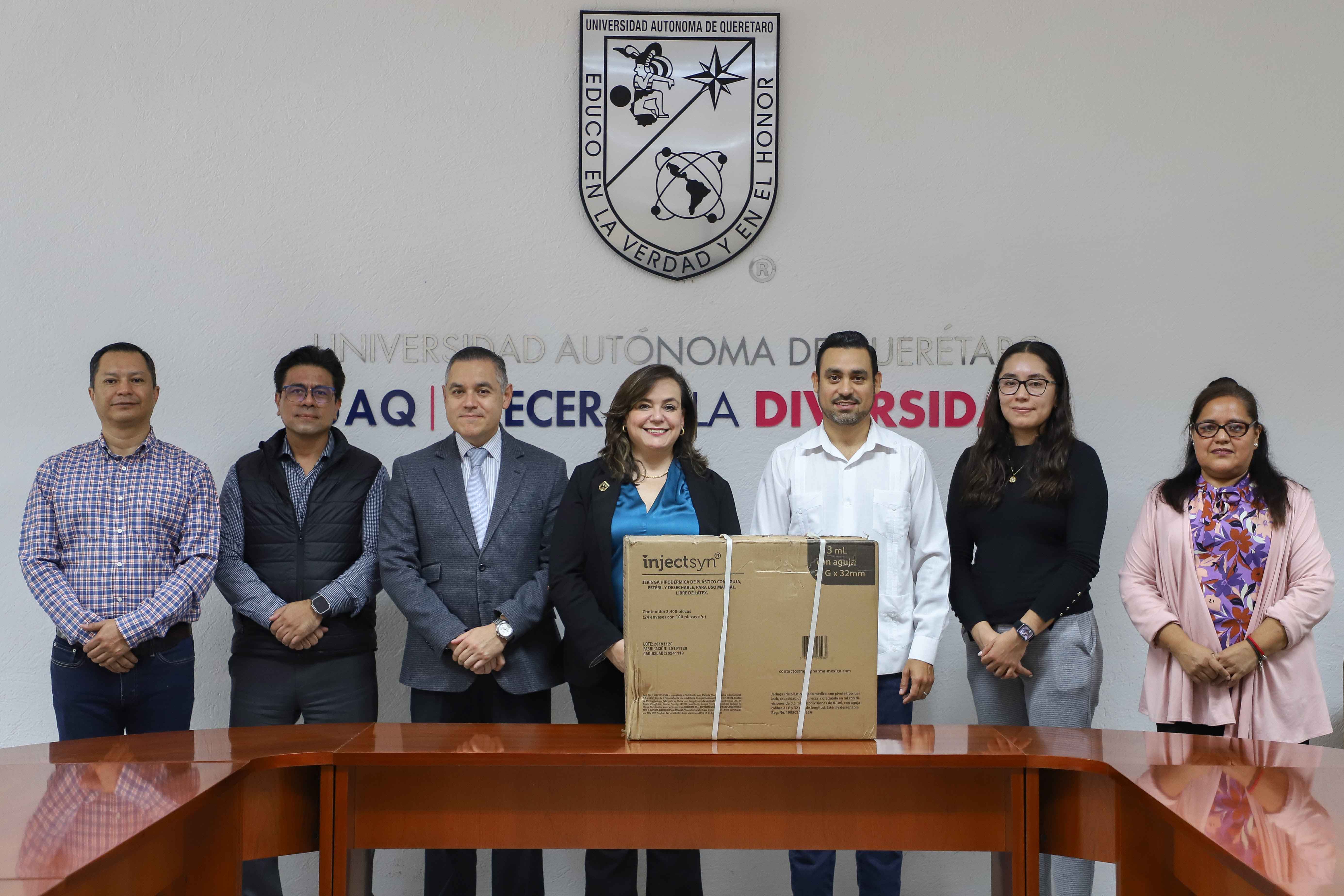 La Universidad Autónoma de Querétaro (UAQ) recibió una importante donación de 14,400 jeringas de parte del diputado local Homero Barrera Mcdonald, destinadas a fortalecer las prácticas y formación de estudiantes de las áreas de Enfermería, Medicina y Química. La rectora, Dra. Silvia Amaya Llano, junto con autoridades de las facultades beneficiadas, agradeció este apoyo que permitirá mejorar la capacitación y atención en salud, destacando la colaboración entre el Congreso estatal y la universidad.