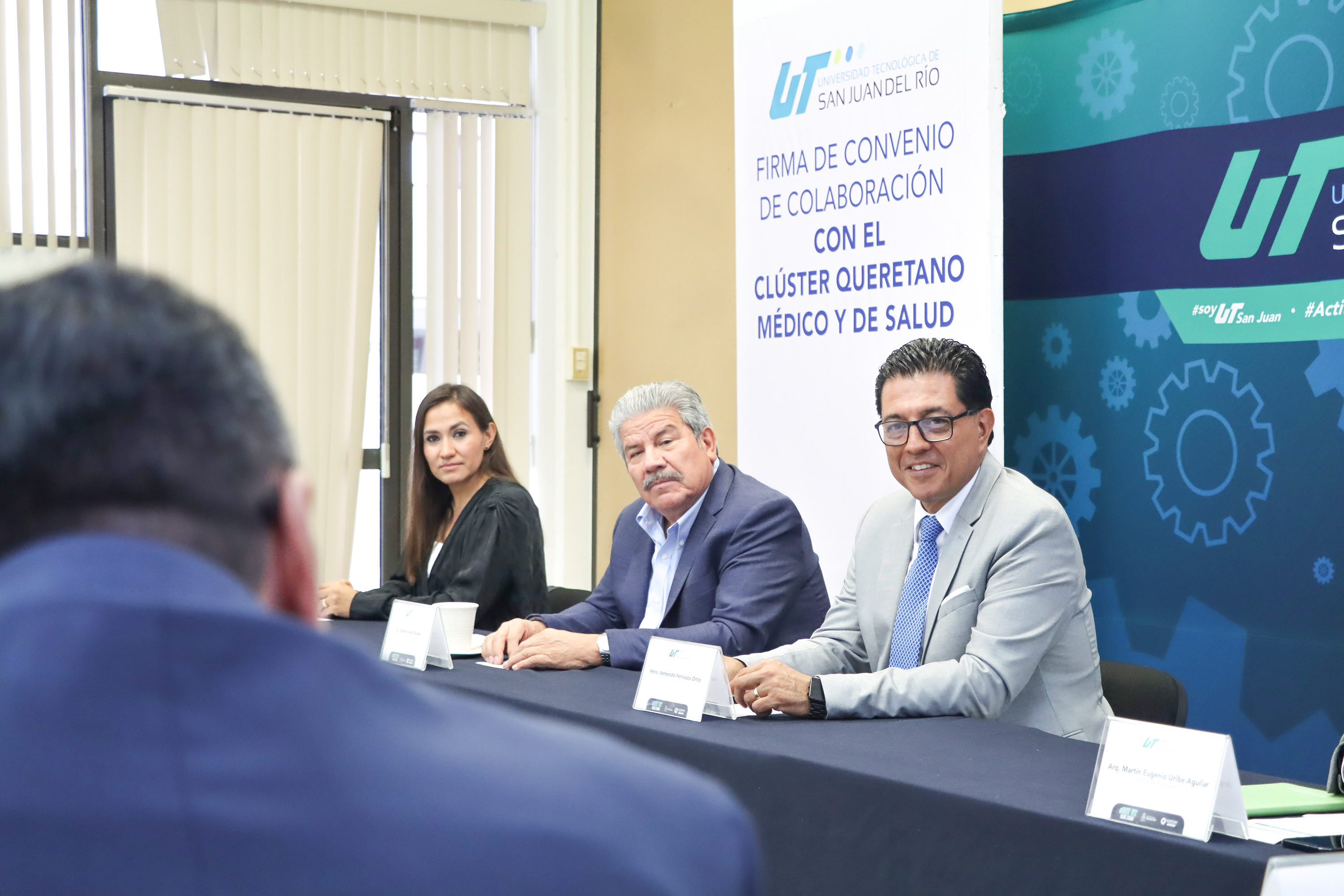 La Universidad Tecnológica de San Juan del Río conformó una alianza con el Clúster Médico y de Salud de Querétaro, respaldada en la estrategia de triple hélice que busca fortalecer la vinculación y generar proyectos innovadores que beneficien al sector educativo y el sector salud, en una ceremonia encabezada por el rector Fernando Ferrusca Ortiz y el presidente del Clúster, Ramón Soto Ruelas.