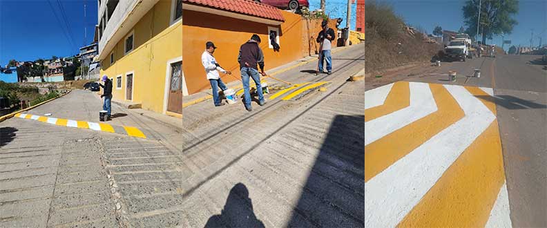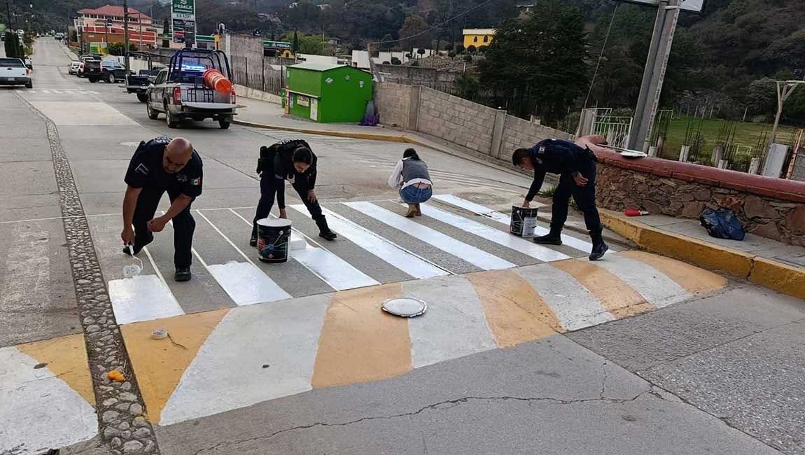 Elementos de Seguridad Pública y Tránsito Municipal de San Joaquín, en coordinación con el área de Servicios Municipales, realizan labores de instalación de señalamiento vial, pintura de guarniciones y delimitación de pasos peatonales