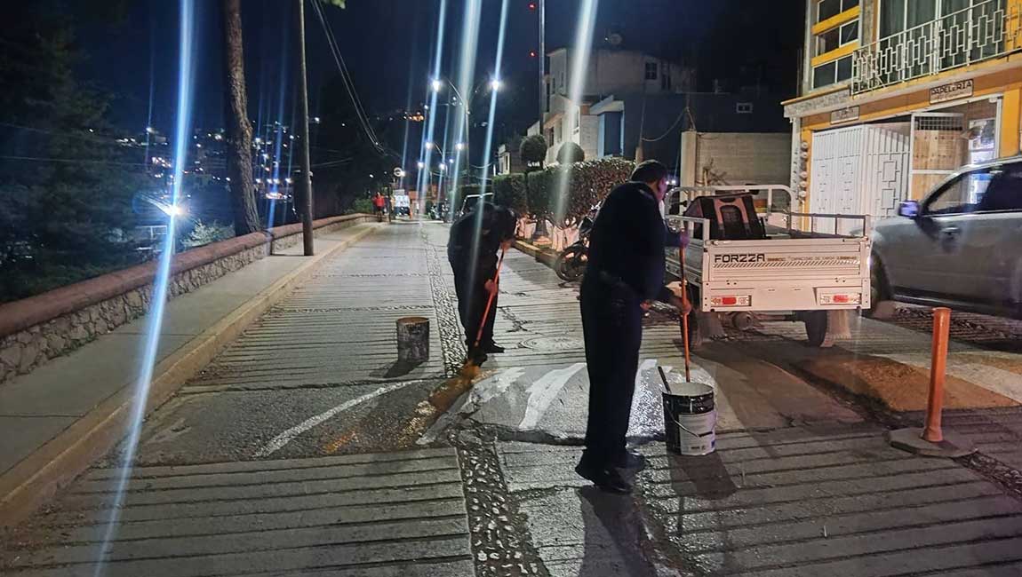 Elementos de Seguridad Pública y Tránsito Municipal de San Joaquín, en coordinación con el área de Servicios Municipales, realizan labores de instalación de señalamiento vial, pintura de guarniciones y delimitación de pasos peatonales