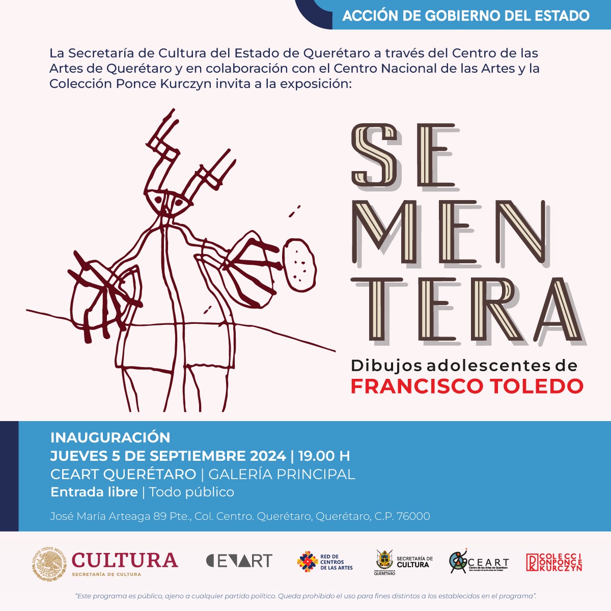 A partir de este jueves 5 de septiembre la Galería Principal del Centro de las Artes de Querétaro (CEART), recibirá la exposición Sementera. Dibujos adolescentes de Francisco Toledo, conformada por más de 70 obras del maestro juchiteco, y que llega a la capital queretana gracias a la colaboración de la Secretaría de Cultura del estado (SECULT), la Colección Ponce Kurczyn (CPK) y el Centro Nacional de las Artes (CENART).