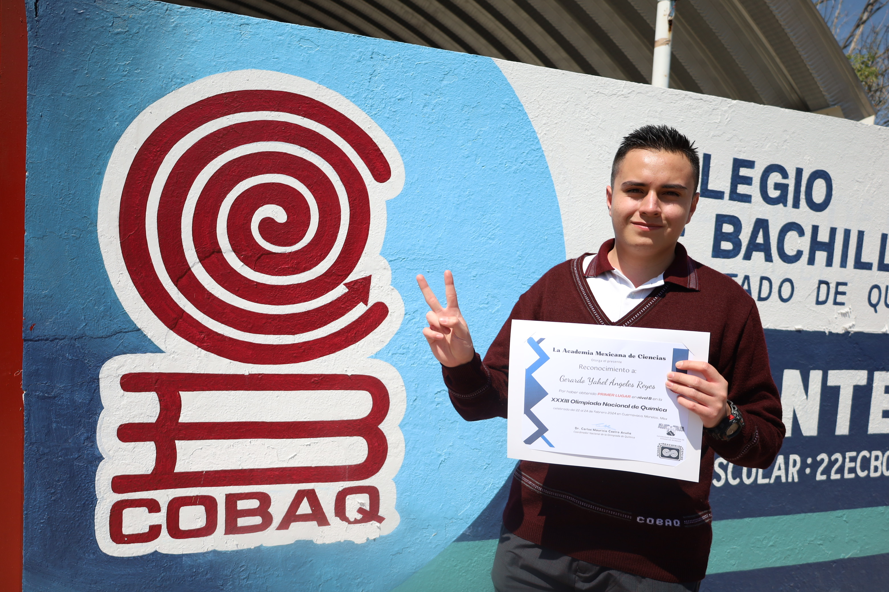 El director general del Colegio de Bachilleres del Estado de Querétaro (COBAQ), León Enrique Bolaño Mendoza, felicitó al estudiante Gerardo Yahel Ángeles Reyes, del plantel 5 Cadereyta, quien obtuvo medalla de oro en la XXXIII Olimpiada Nacional de Química, celebrada en Cuernavaca. Ahí aseguró que dicho resultado es representativo de la educación integral que el Colegio ofrece, y que lo ubica en el seleccionado de México para participar en la 56th International Chemistry Olympiad - IChO 2024, a celebrarse en Arabia Saudita.