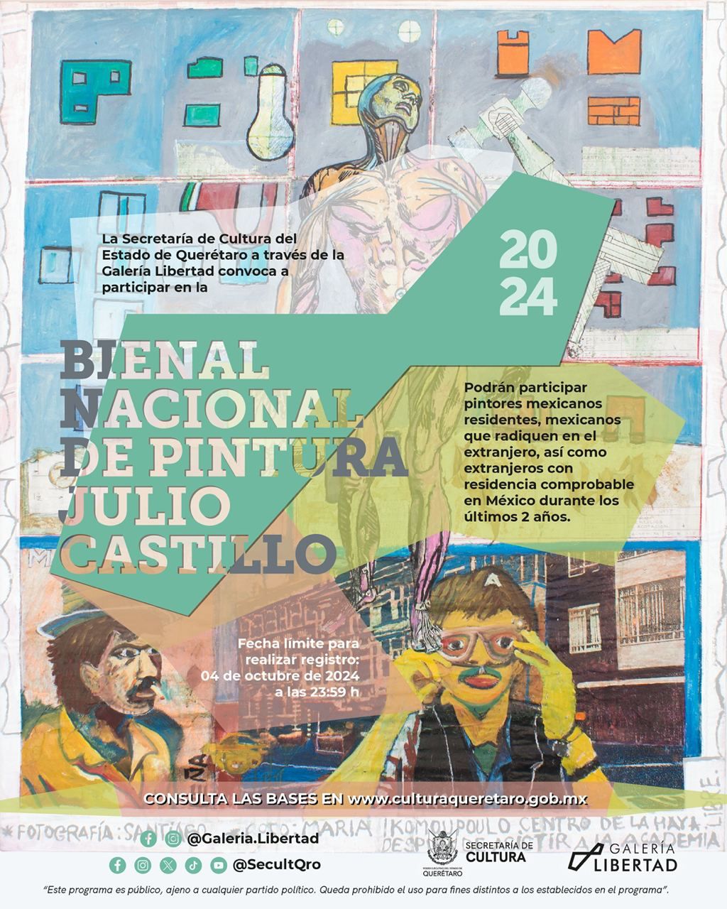 La Secretaría de Cultura del estado (SECULT) emitió la convocatoria dirigida a pintores y pintoras mexicanos y extranjeros con residencia mínima de dos años en México, a concursar en la Bienal Nacional de Pintura Julio Castillo 2024, que en esta edición otorgará un premio de adquisición por un monto de hasta 150 mil pesos para que la obra ganadora pase a formar parte de la Galería Libertad.