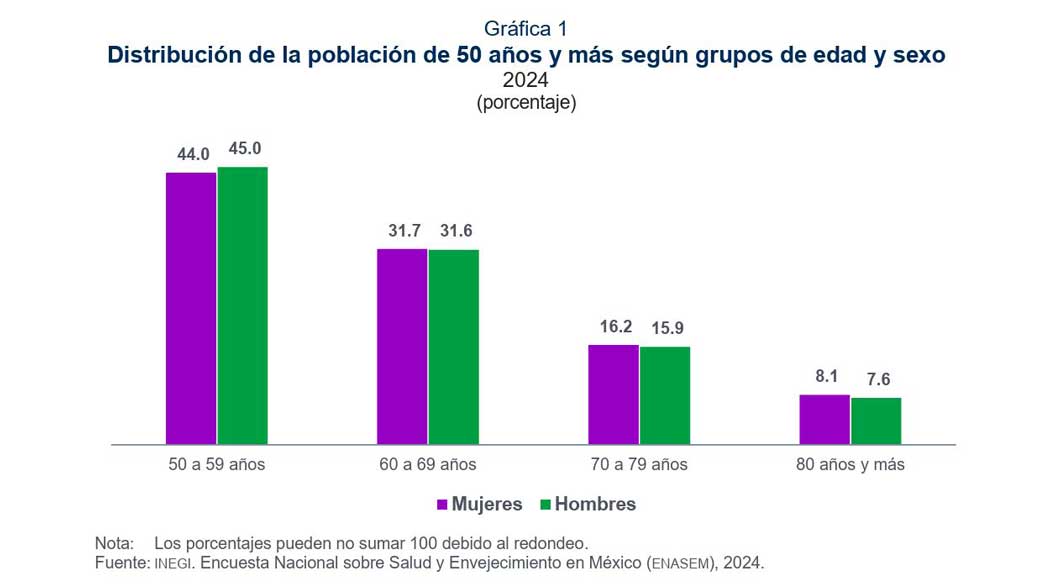 En cuanto a las responsabilidades de cuidado, el 35.0% de las personas de 50 años y más se encarga de menores de 12 años o de adultos enfermos o con discapacidad, una carga que recae principalmente en mujeres, con un 43.8%, frente al 25.1% en hombres. Estos datos evidencian no solo los desafíos en salud, sino también las condiciones sociales y familiares que enfrentan millones de adultos mayores en México.